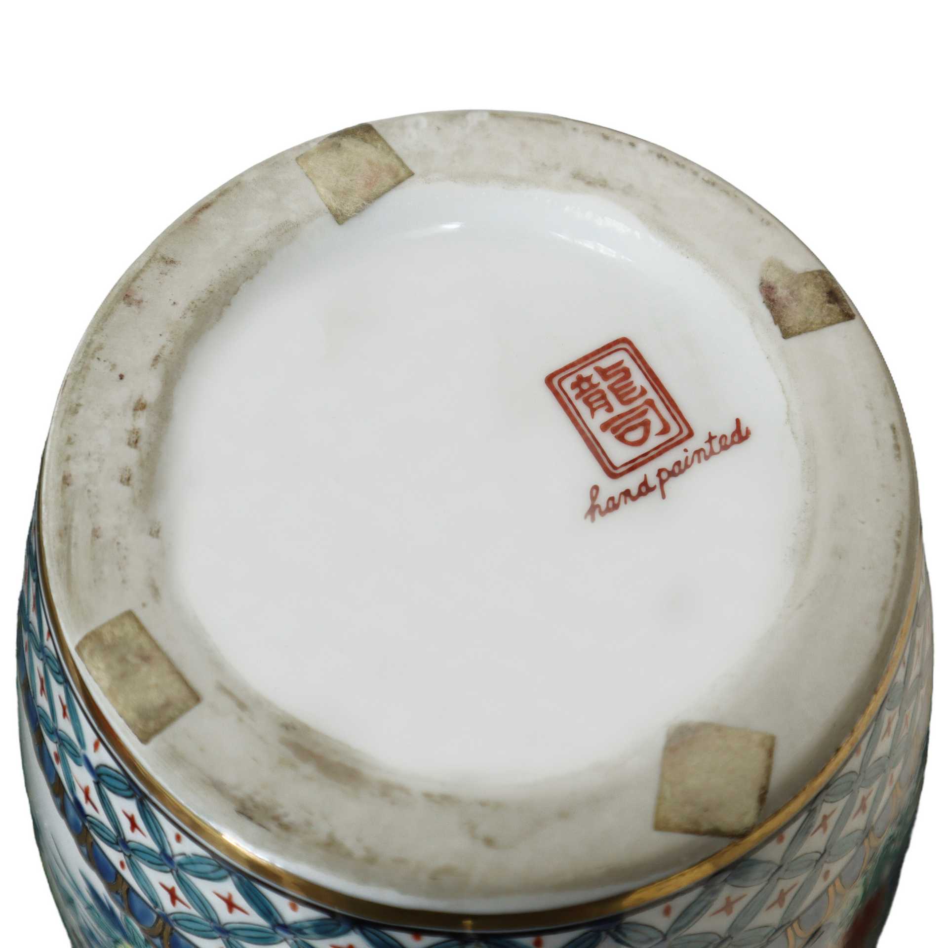 Vaso cinese in porcellana, con decori floreali e bordo dorato