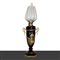Coppia di lumi in porcellana dipinta con cineserie , h cm 65 A smalti e in madreperla, avorio e oro, applicazioni in ottone dorato, diffusore in vetro a tulip