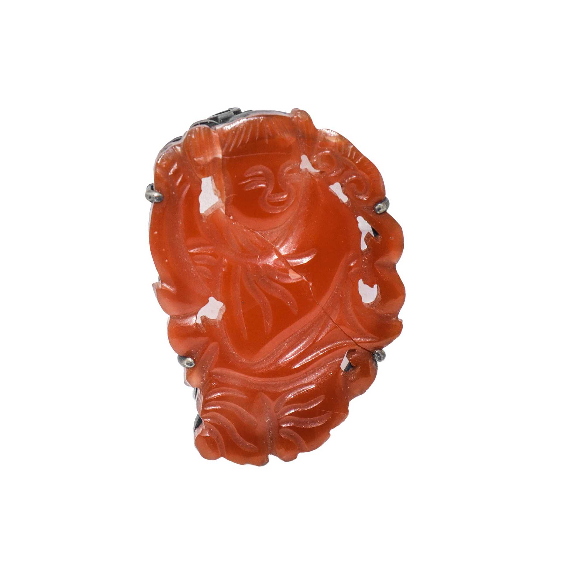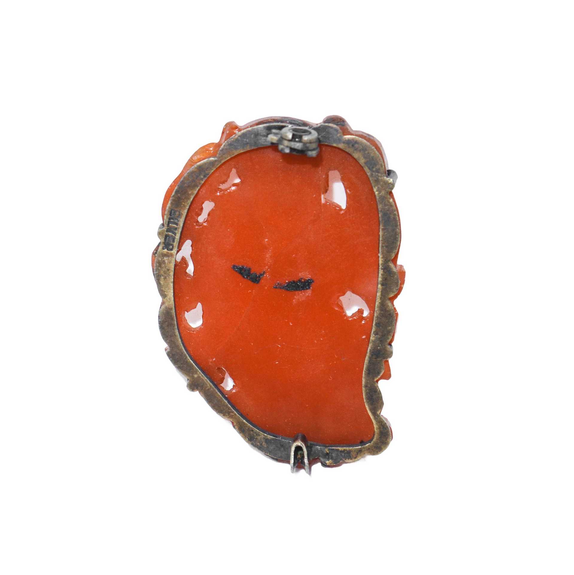 Spilla cinese in corallo intagliata a mano raffigurante un Buddha sorridente