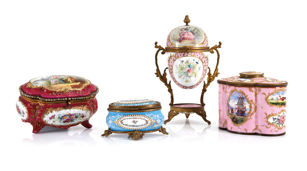 DUE SCATOLE IN PORCELLANA E DUE IN METALLO DECORATO A SMALTI, XIX-XX SECOLO, in porcellana con applicazioni e a forma di uovo con scene galanti, in metallo con decori floreali e a scene di porto; usure e lieve scheggiatura.
