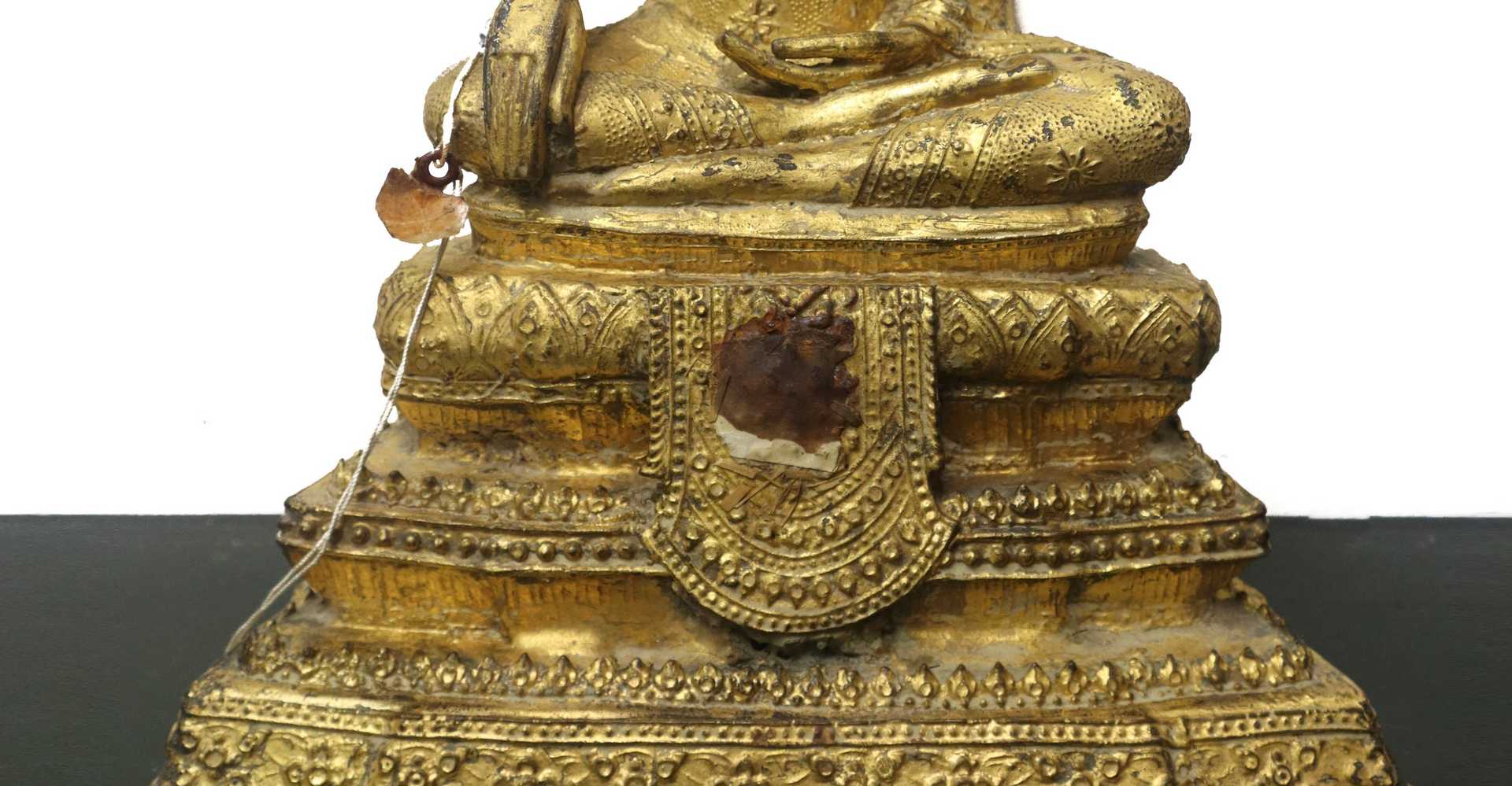 Precedente Lotto 133 Successivo Art La Rosa Casa d'Aste - Viale Africa 12, 95129 CATANIA #152: Arte Orientale #152: Arte Orientale giovedì 6 novembre 2025 ore 17:00 (UTC +01:00) Buddha antico in bronzo dorato Buddha antico in bronzo dorato , h cm 35 x cm 23 x cm 14