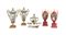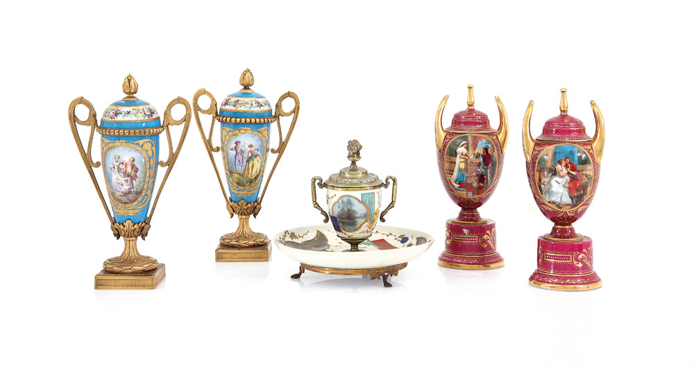 DUE COPPIE DI VASI E UN CALAMAIO IN PORCELLANA CON MONTATURE IN METALLO DORATO, FINE XIX SECOLO, una coppia di vasi in stile Vienna con scene storiche su fondo rosso e una in stile Sevrès con scene galanti su fondo azzurro, calamaio con piatto decorato a paesaggi; difetti e usure.