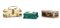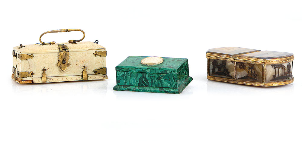 DUE TABACCHIERE E UN COFANETTO, XIX SECOLO, una in malachite con cammeo e una in pietra dura con decoro a rovine applicato; cofanetto in placchette di osso; mancanze e usure.