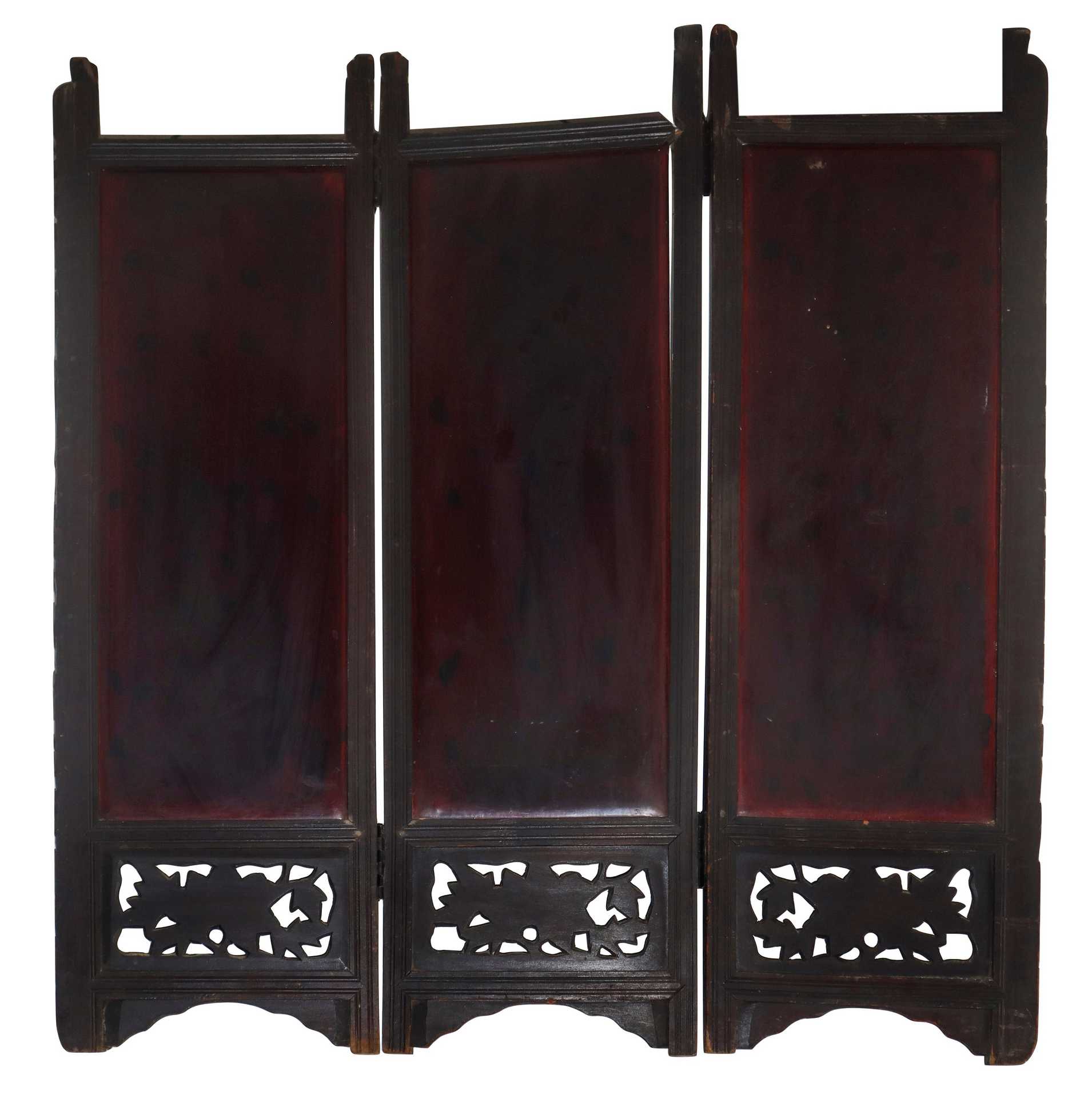 Separè cinese basso in legno con inserti in madreperla e legni chiari.
