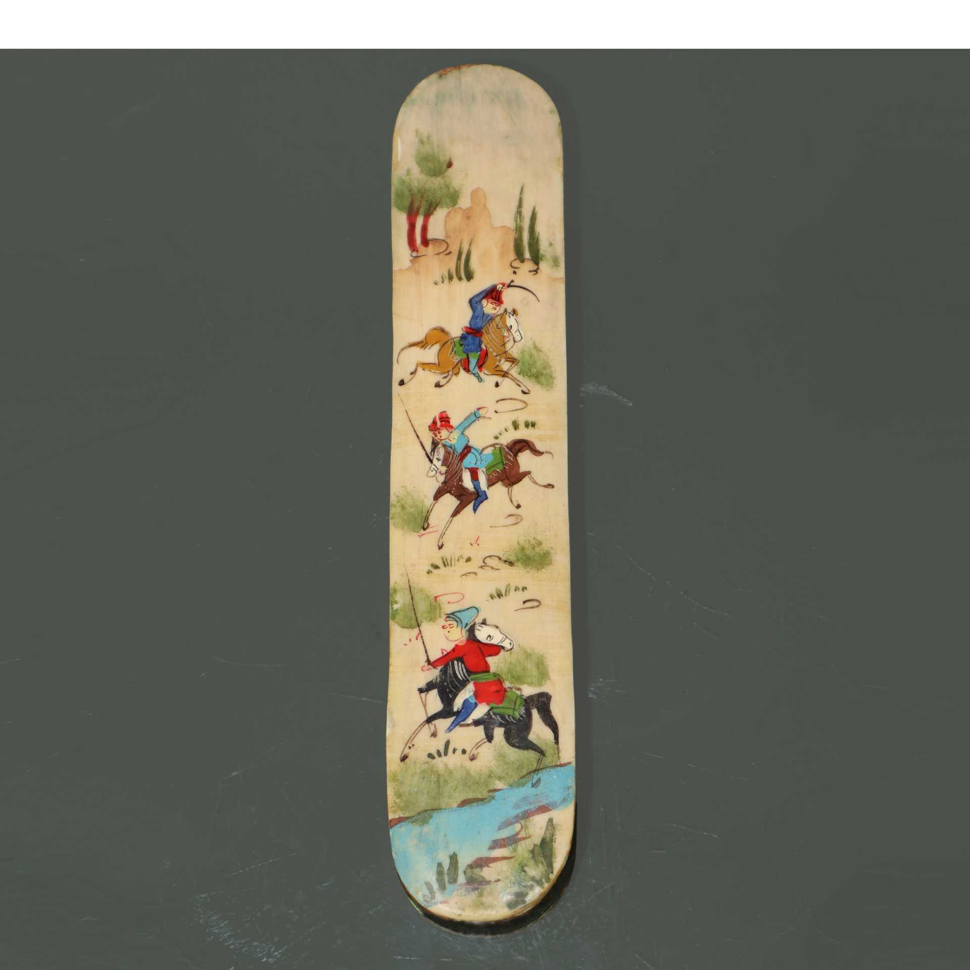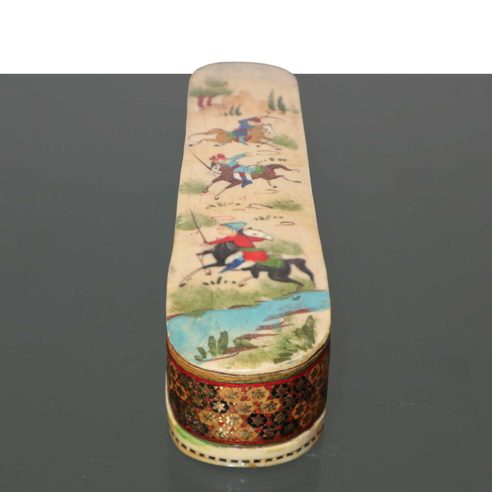 Astuccio orientale in legno con coperchio scorrevole dipinto a mano , h cm 3.5x21 Astuccio orientale in legno con coperchio scorrevole, dipinto a mano sui lati con decori nei colori del rosso, verde, nero, bianco, dorato. Decorazione di un paesaggio fluviale con tre uomini a cavallo su un lato dell'astuccio.