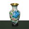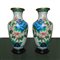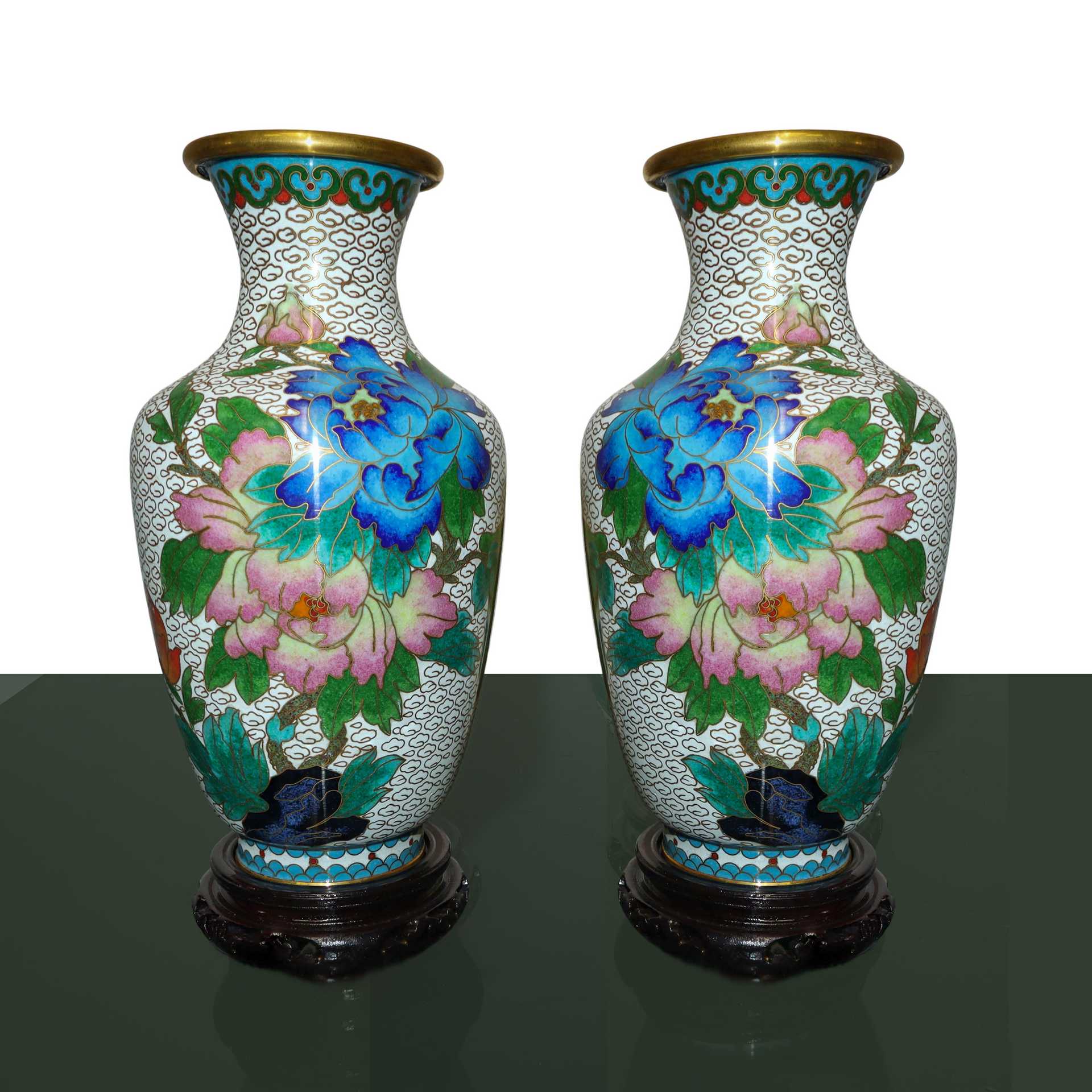 Coppia di vasi cloisonnet con fondo bianco e decori floreali con base in legno