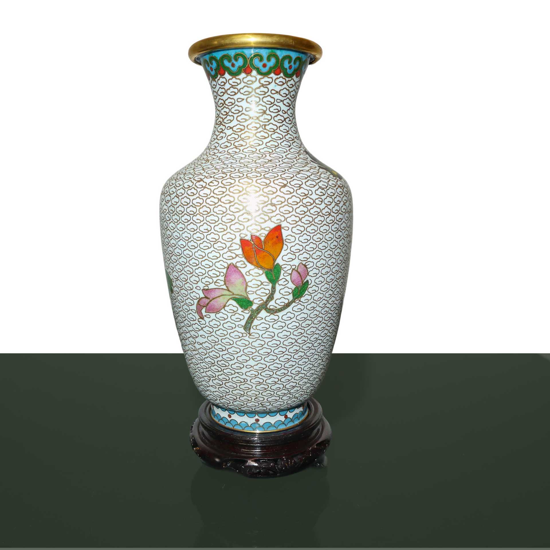 Coppia di vasi cloisonnet con fondo bianco e decori floreali con base in legno , h cm 22 (senza base) , h cm 25 (con base) Una delle due basi in legno ha una rottura