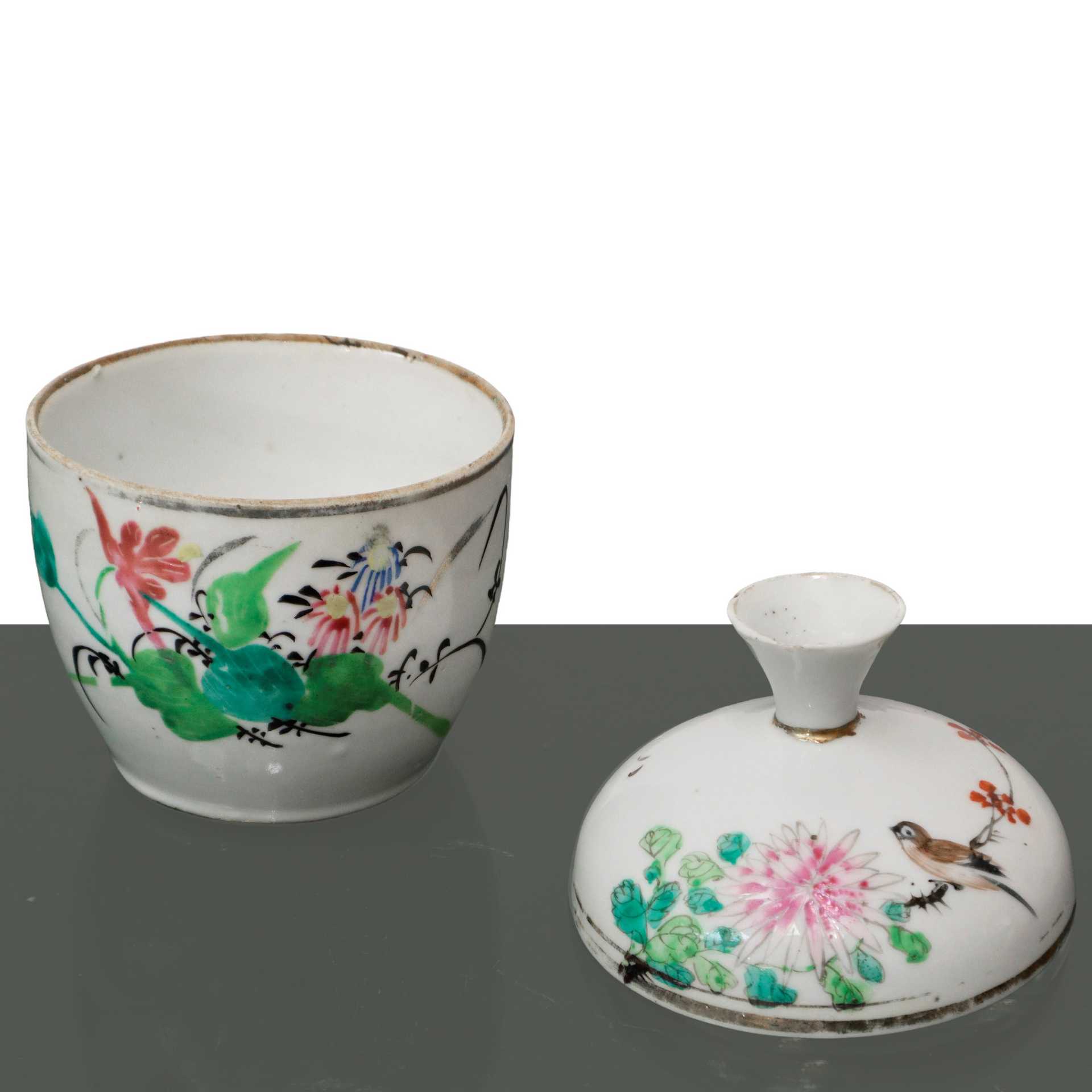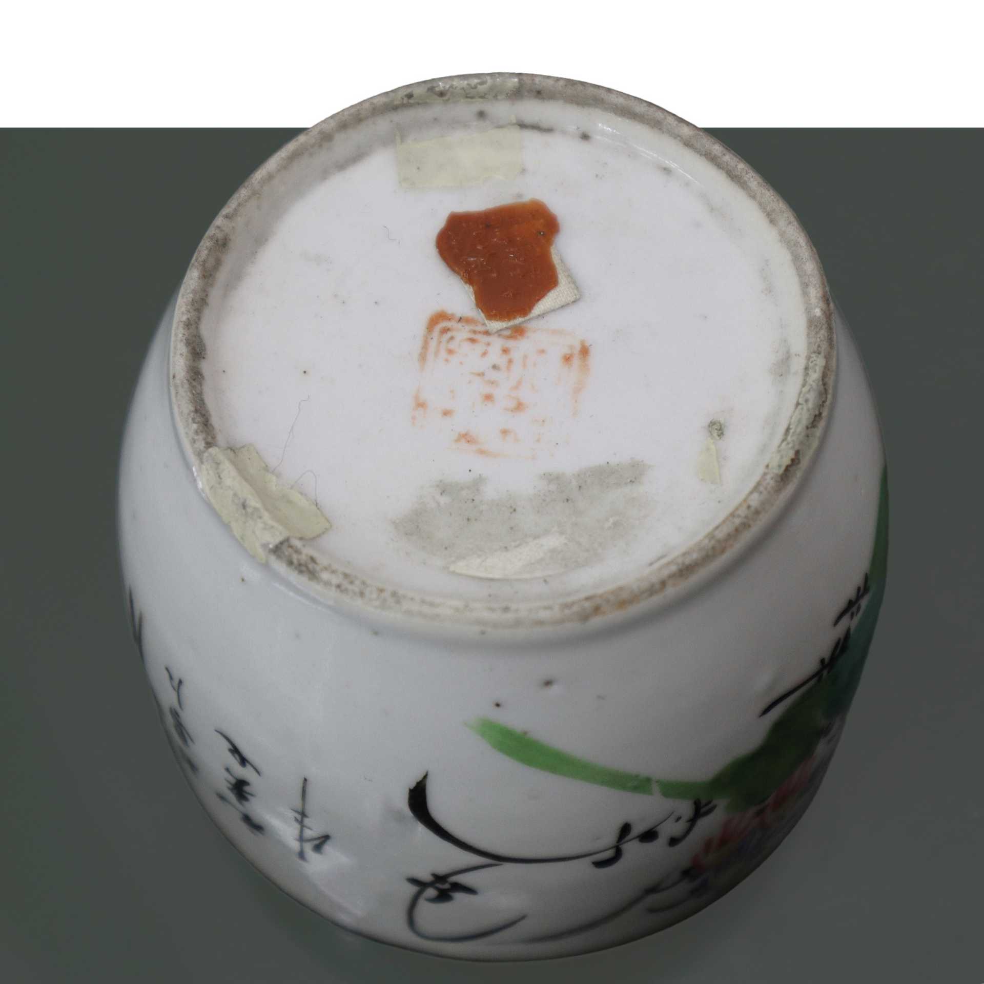 Vaso cinese in porcellana bianca a forma tonda con decori floreali , h cm 13.5x9 Vaso cinese a forma tonda in ceramica bianca con decorazioni floreali policrome, uccellino e iscrizioni con caratteri cinesi. Coperchio con pomello a imbuto e dettagli dorati. Timbro con caratteri cinesi e timbro di cera lacca alla base.