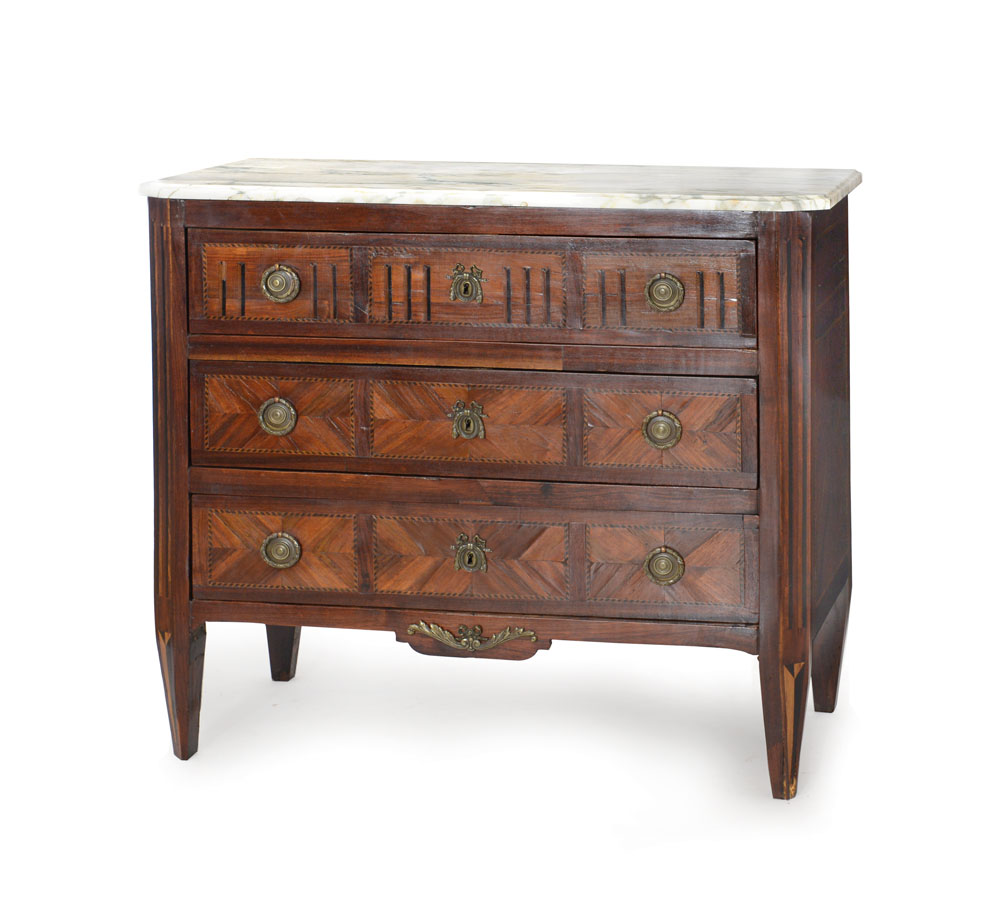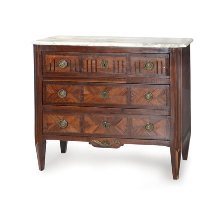 CASSETTONE INTARSIATO IN STILE LUIGI XVI, XIX SECOLO, a tre cassetti con piano in marmo e decori geometrici entro riserve; difetti, usure e sbeccature.