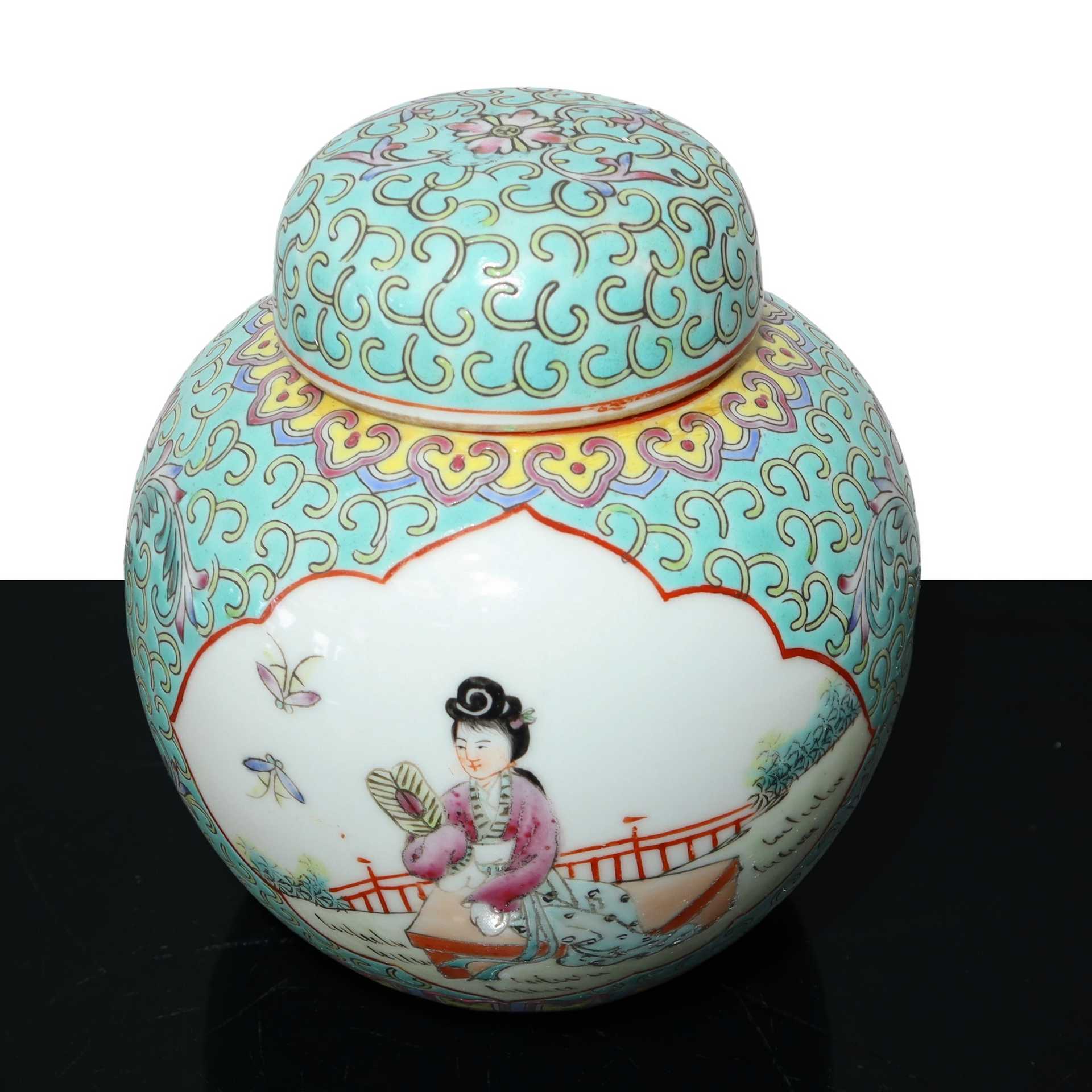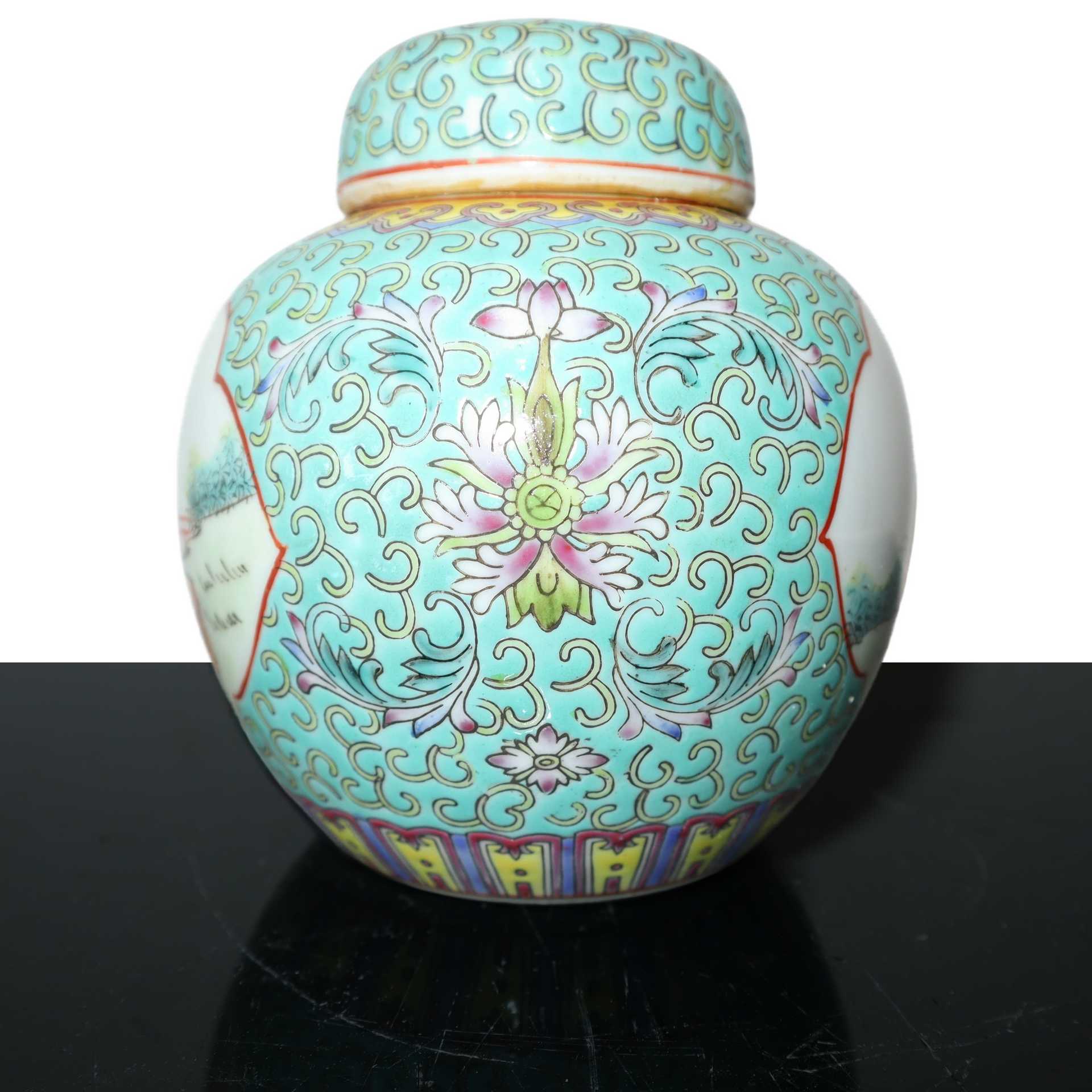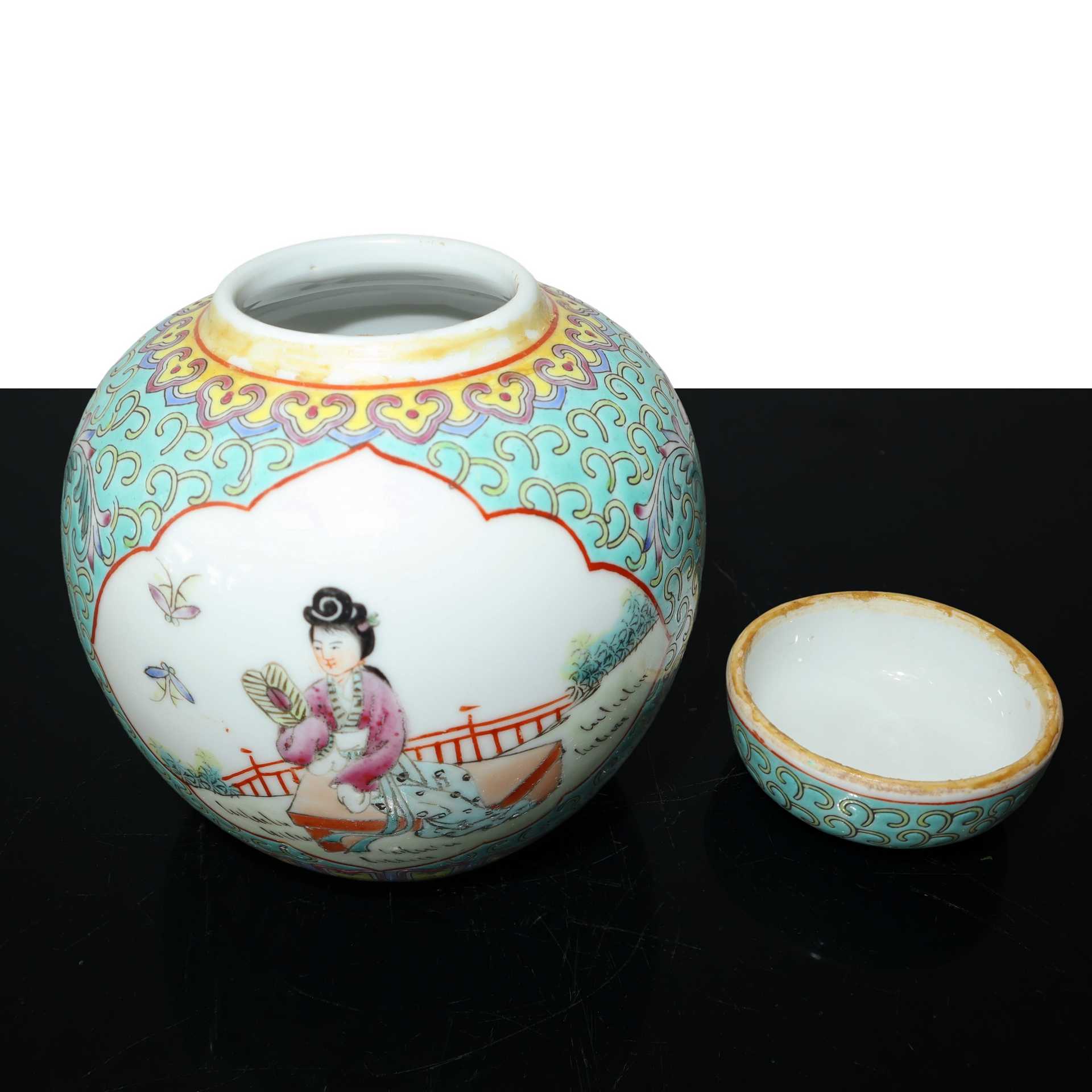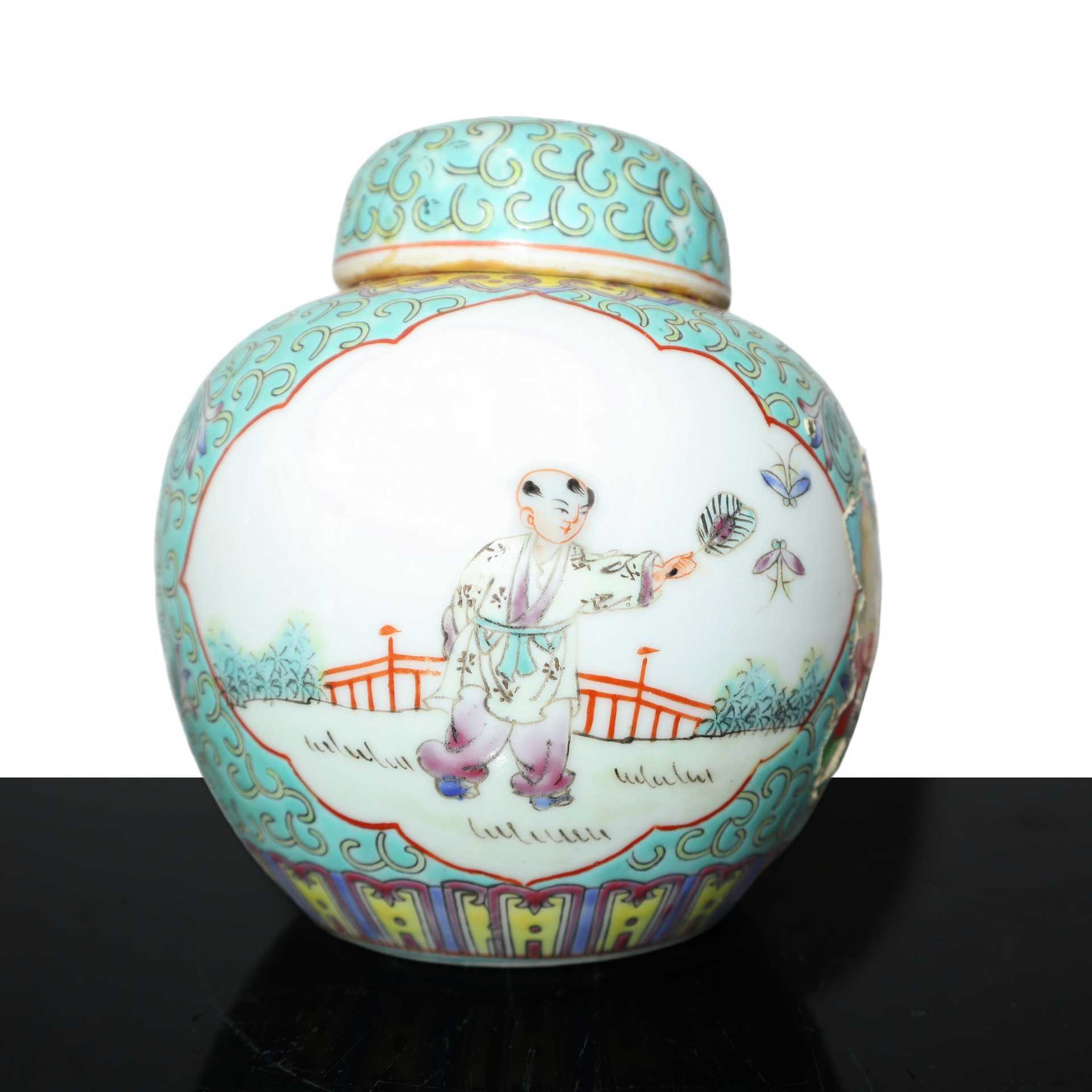 Poutiche cloisonnet portazenzero con scene di genere sul fronte e sul retro , h cm 12