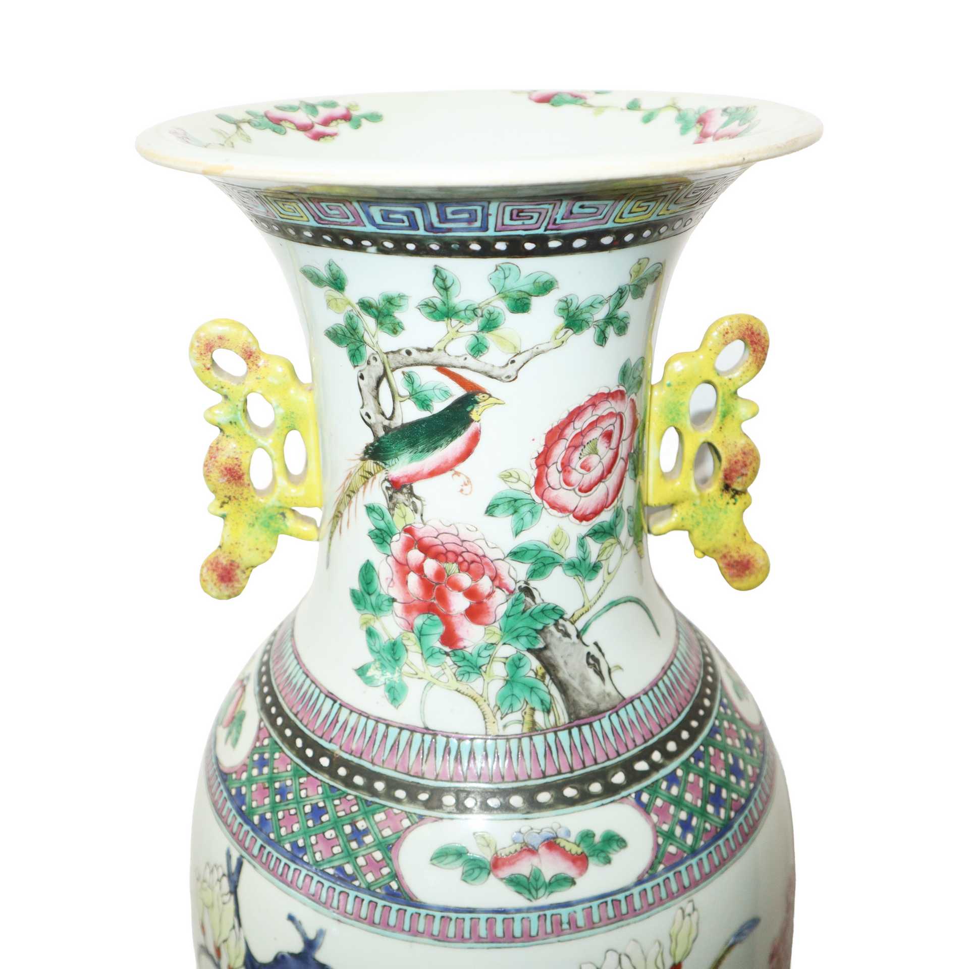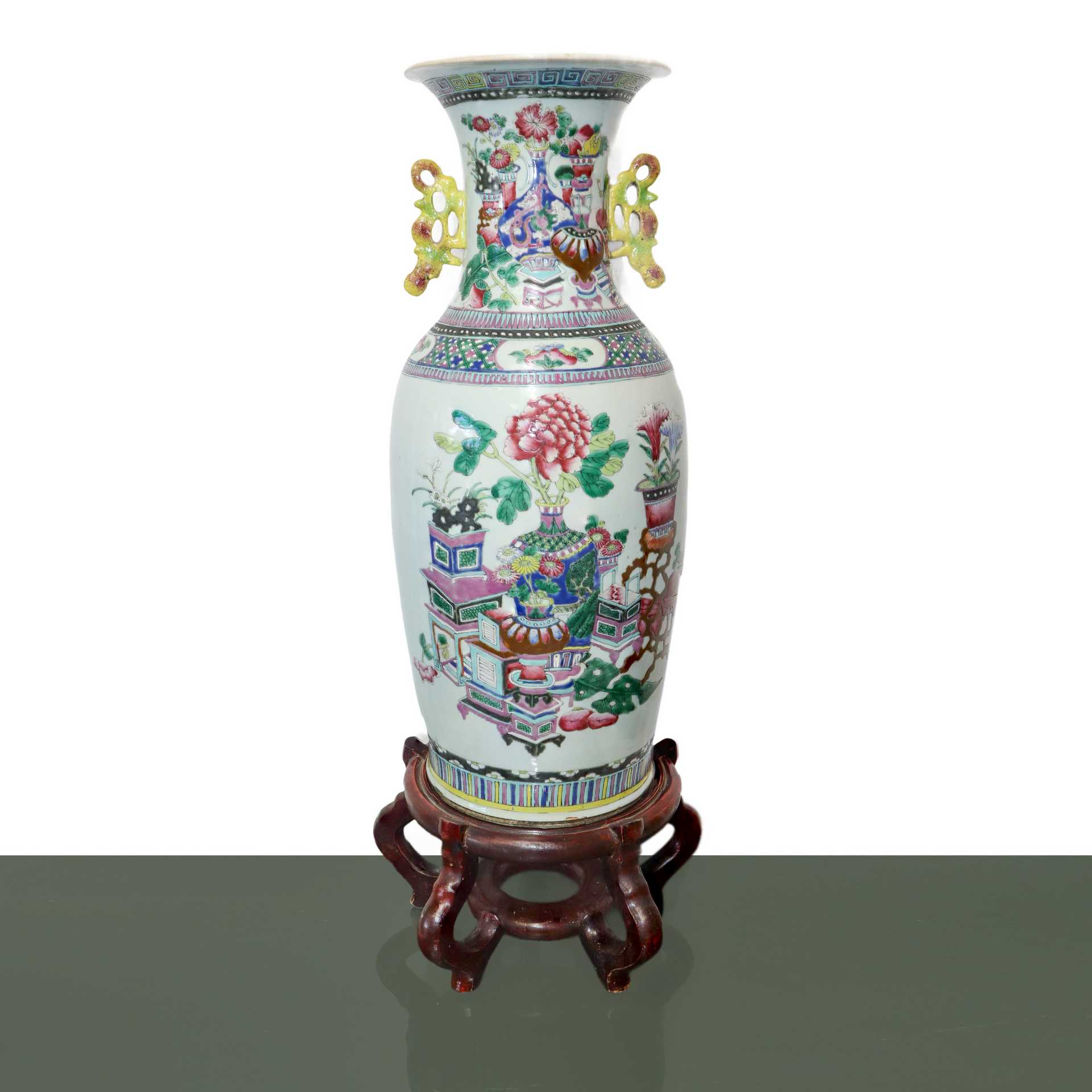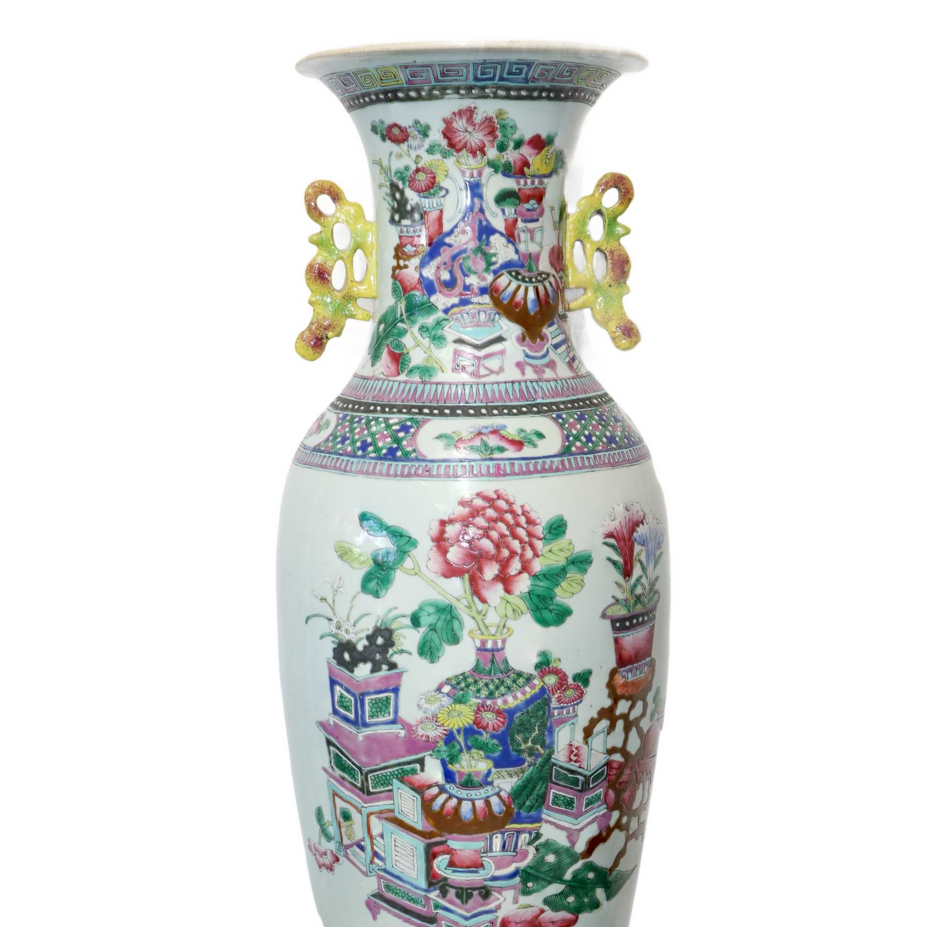 Vaso cinese in porcellana con motivi floreali, Qinq dinastia primi 20° secolo , h cm 58 con base cm 14 totale cm 74
