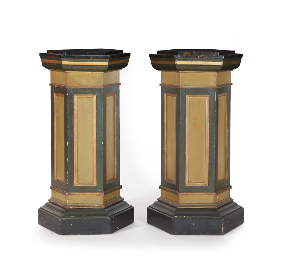 COPPIA DI BASI A COLONNA IN LEGNO SCOLPITO E DIPINTO, FINE XIX SECOLO, a sezione esagonale con profili a rilievo su basi gradinate; usure e lievi sbeccature.