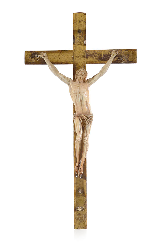 AVORIO EUROPEO CROCEFISSO IN AVORIO, XVIII SECOLO, su croce in legno dorato;...