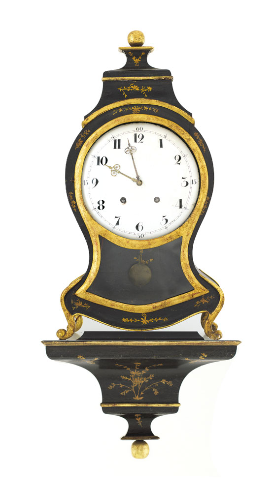 PENDOLA CARTEL IN LEGNO LACCATO E DORATO, ROBERT, FINE XVIII SECOLO, cassa sagomata con mensola e cappello cimati da sfera, quadrante smaltato con numeri arabi; restauri, sbeccature da revisionare.