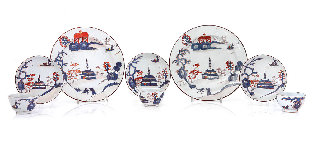 COPPIA DI PIATTI E TRE TAZZE CON PIATTO IN MAIOLICA, MILANO, P.RUBATI O F.CLERICI, 1745-1780, decoro "al carabiniere"; sbeccature e qualche restauro.