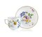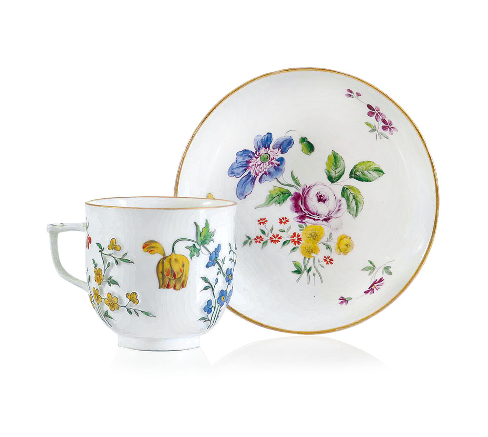 TAZZA CON PIATTO IN PORCELLANA, MEISSEN, 1750 CA., decoro con fiori a rilievo e a mazzetti floreali policromi, profilo in oro.