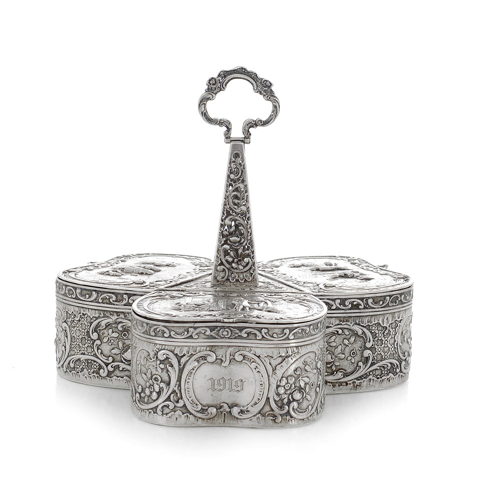 SCATOLA IN ARGENTO, XIX SECOLO, trilobata con tre scomparti con coperchi incernierati, presa ad obelisco traforato con anello, decori a scene di vita con figure entro paesaggio e fiori.