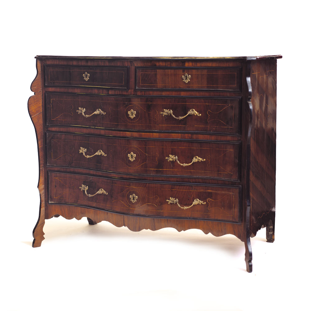 CASSETTONE LASTRONATO IN LEGNI VARI, XVIII SECOLO, fronte mosso a cinque cassetti con alette sporgenti e piano sagomato; restauri, sbeccature e sostituzioni