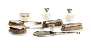 SERVIZIO DA TOELETTA Servizio da toeletta in argento, cristallo molato e tartaruga. Composto da : quattro spazzole,1 specchio, 1 porta cipria e tre portaprofumi di varie misure. Totale nove pz. Periodo inizio XX sec. Silver toilet service, cut crystal and tortoise. Coposto by: four brushes, 1 mirror, 1-port and three portaprofumi powder of various sizes. Total of nine pieces. Period early twentieth century.