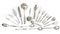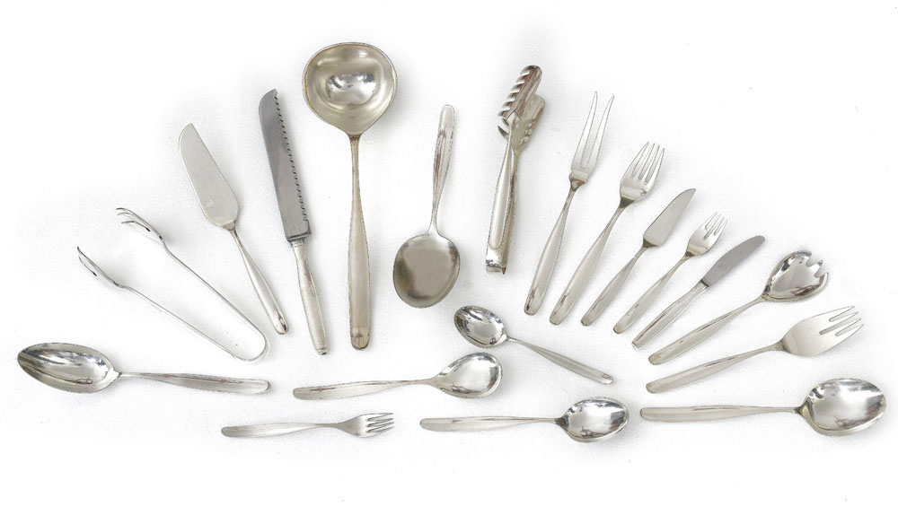 SERVIZIO DI POSATE IN ARGENTO, BOLOGNA, CLEMENTI, XX SECOLO, liscio, composto da ventiquattro forchette e coltelli, undici cucchiai, dodici forchette e coltelli da pesce, ventiquattro forchette e coltelli da frutta, undici cucchiai da frutta, cinque cucchiaini da gelato, un mestolo e dodici tra posate da portata e accessori; totale pezzi 160; alcuni coltelli con lama sostituita e lieve differenza.