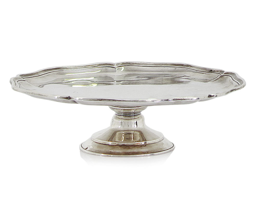 ALZATA IN ARGENTO, TORINO, XVIII SECOLO, ASSAGGIATORE E CONTRASSAGGIATORE G.VERNONI, piano polilobato con bordo scanalato su base circolare.