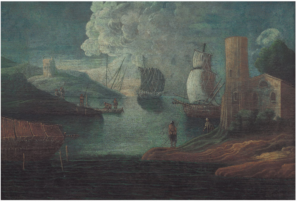 Lotto 447 | PITTORE DEL XVIII SECOLO Marina con velieri Olio su tela, cm 63x92.