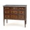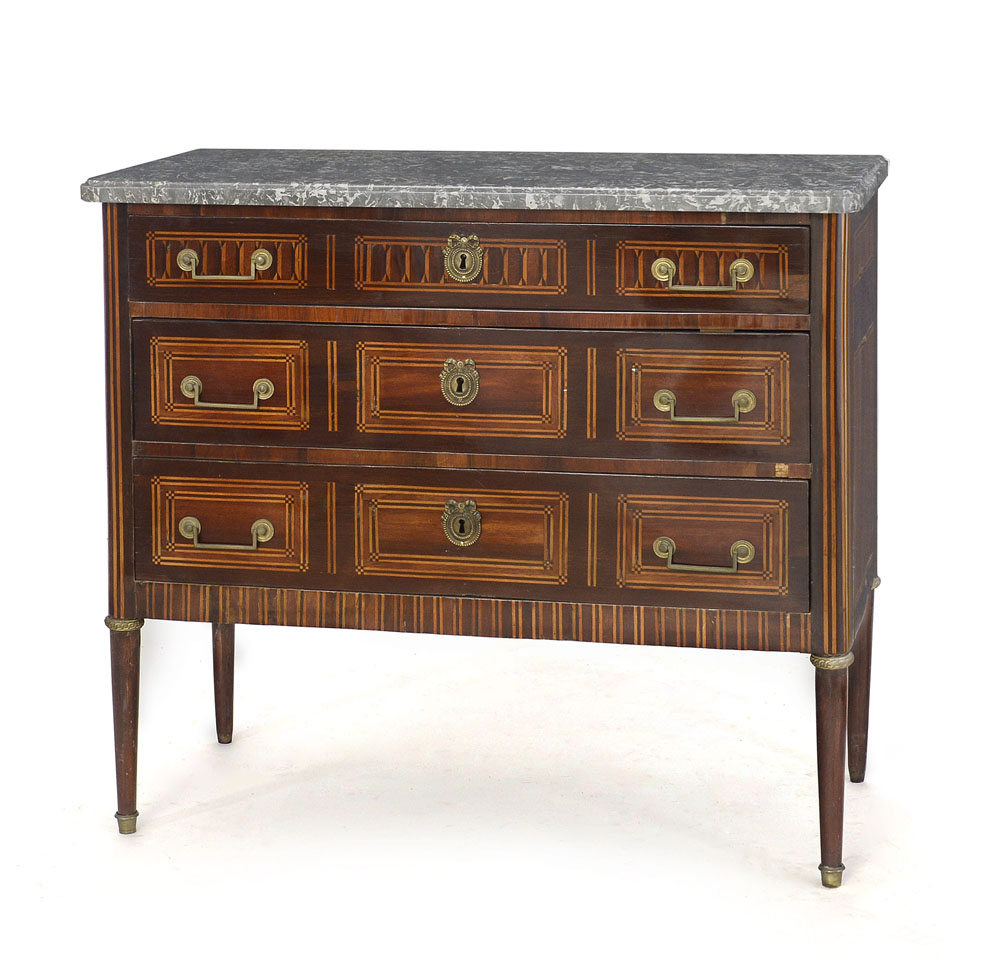 CASSETTONE INTARSIATO IN LEGNI VARI, XIX SECOLO, a tre cassetti con decori geometrici entro riserve, piano in marmo grigio e sostegni rastremati; usure e sbeccature.