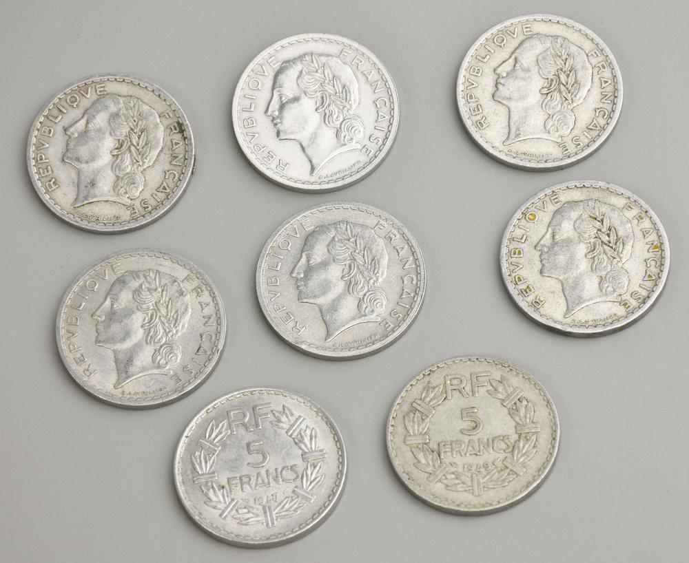 LOTTO DI FRANCHI FRANCESI composto da 8 monete da 5 franchi vari anni di...