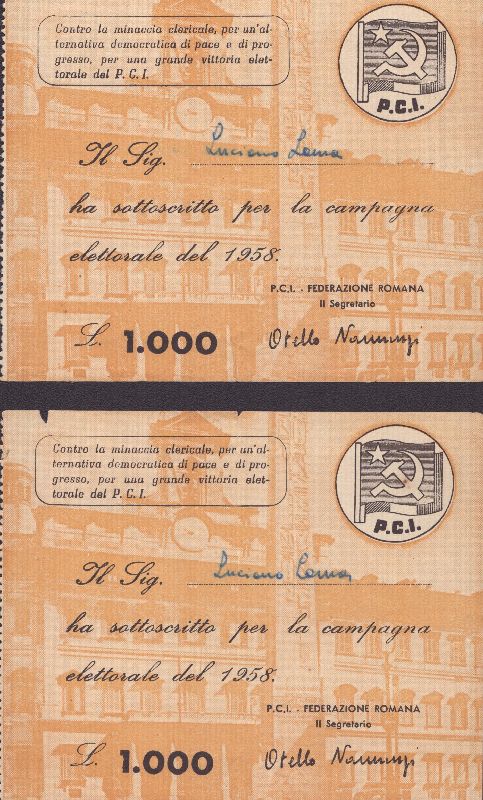 Due biglietti da "L.1000" di sottoscrizione per la campagna elettorale del 1958 rilasciati a Luciano Lama, sezione P.C.I. Federazione Romana. Condizioni buone. Misure cm. 9,5x12