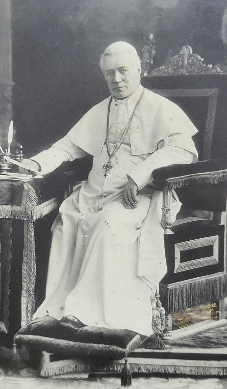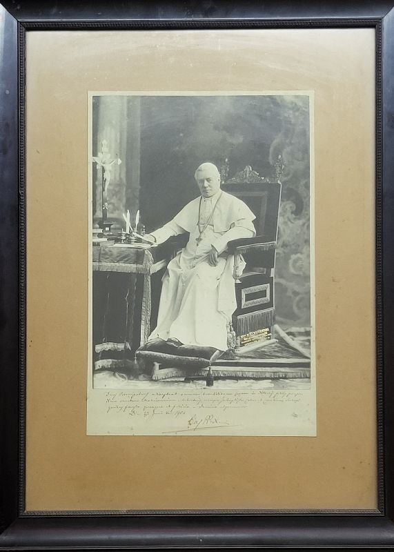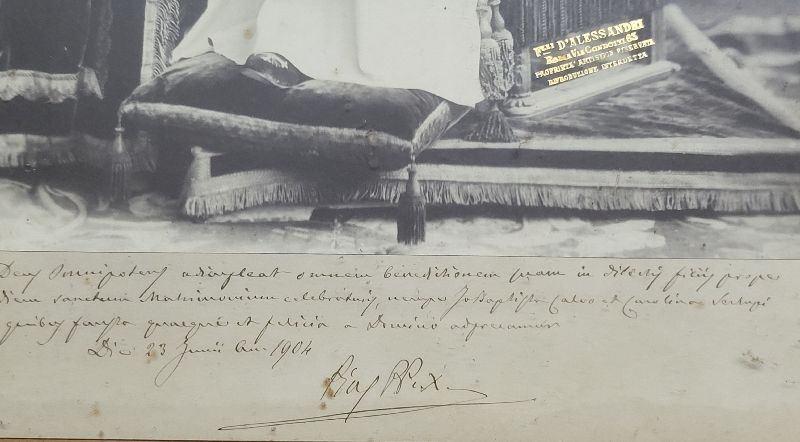 Fotografia, b/n, Papa PIO X (Pius PP. X, nato Giuseppe Melchiorre Sarto; Riese, 2 giugno 1835 – Roma, 20 agosto 1914) con dedica e benedizione scritta in latino, per coppia di coniugi , e firma autografe del Santo Padre.