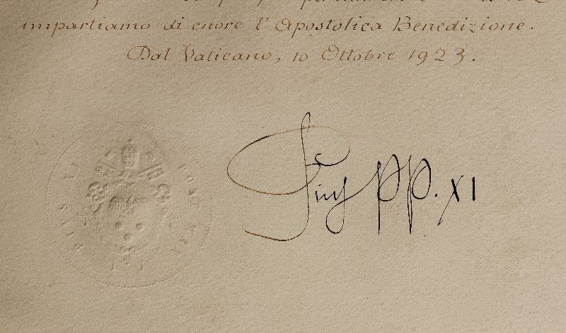 Fotografia ufficiale di S.S. Papa Pio XI benedicente, timbrata a secco G.FELICI Roma - Riproduzione Interdetta applicata su cartoncino bianco, con benedizione apostolica e firma autografa del Santo Padre, datata 1923. Misura cm.39x58, piega al cartoncino, timbro a secco PIUS XI PONT MAX