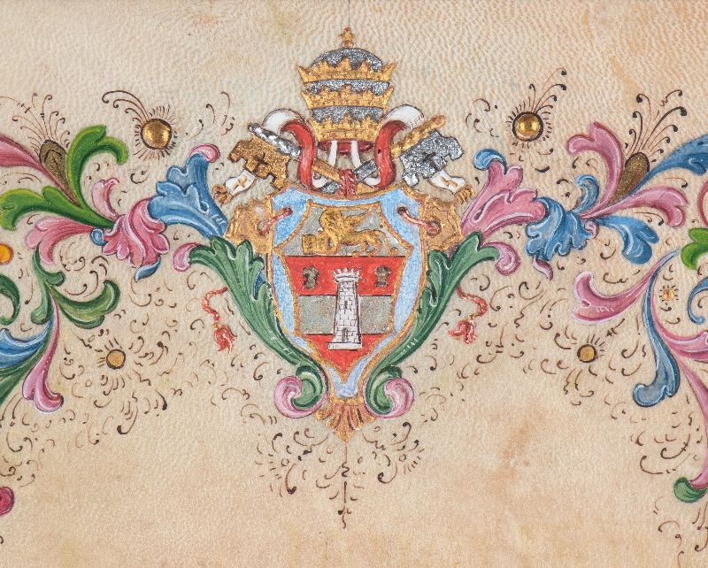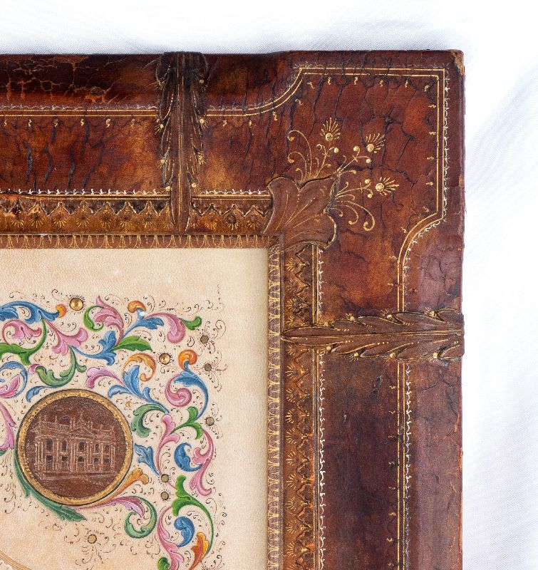 Imponente cornice in cuoio sbalzato con all'interno una pergamena dipinta a mano, ma non compilata, recante lo stemma pontificio di Papa Giovanni XXIII.