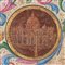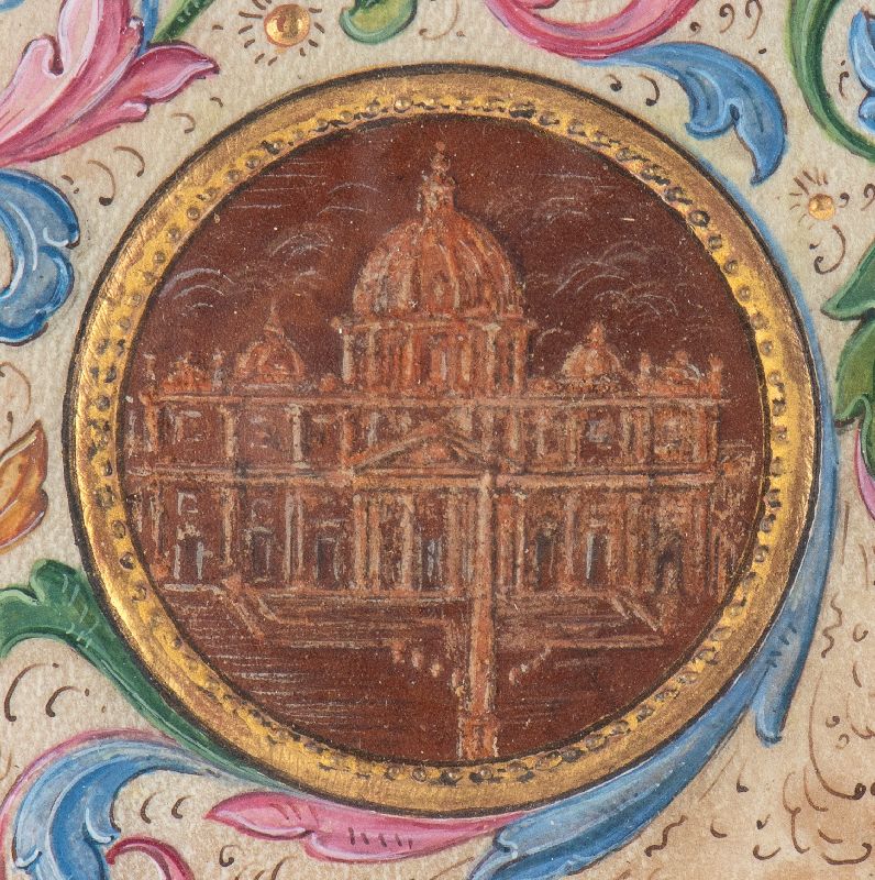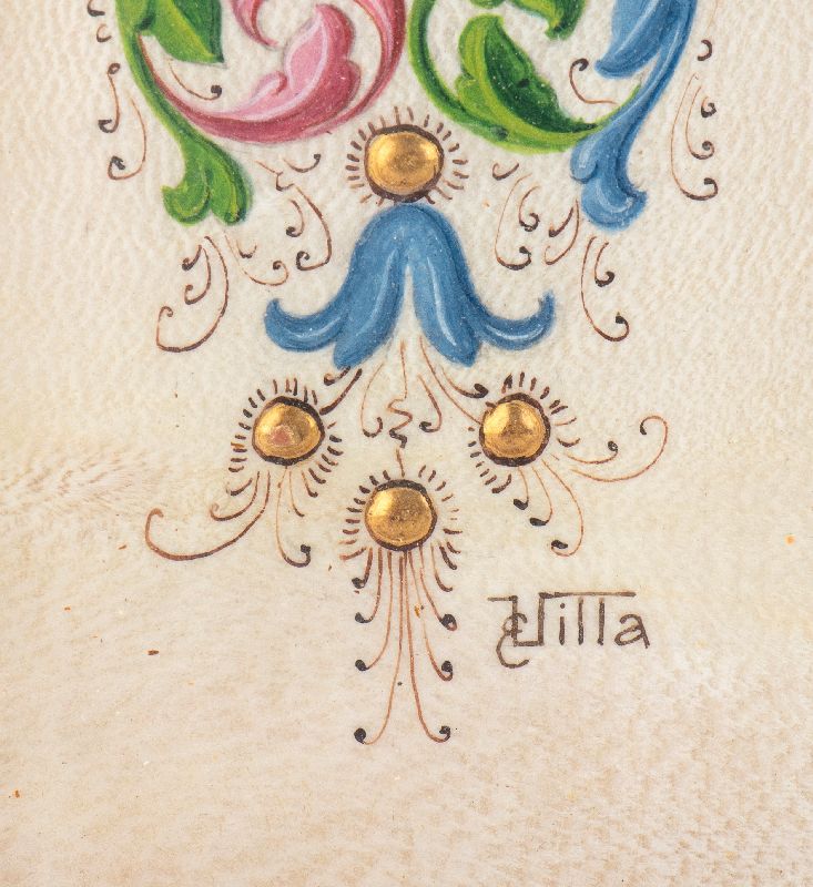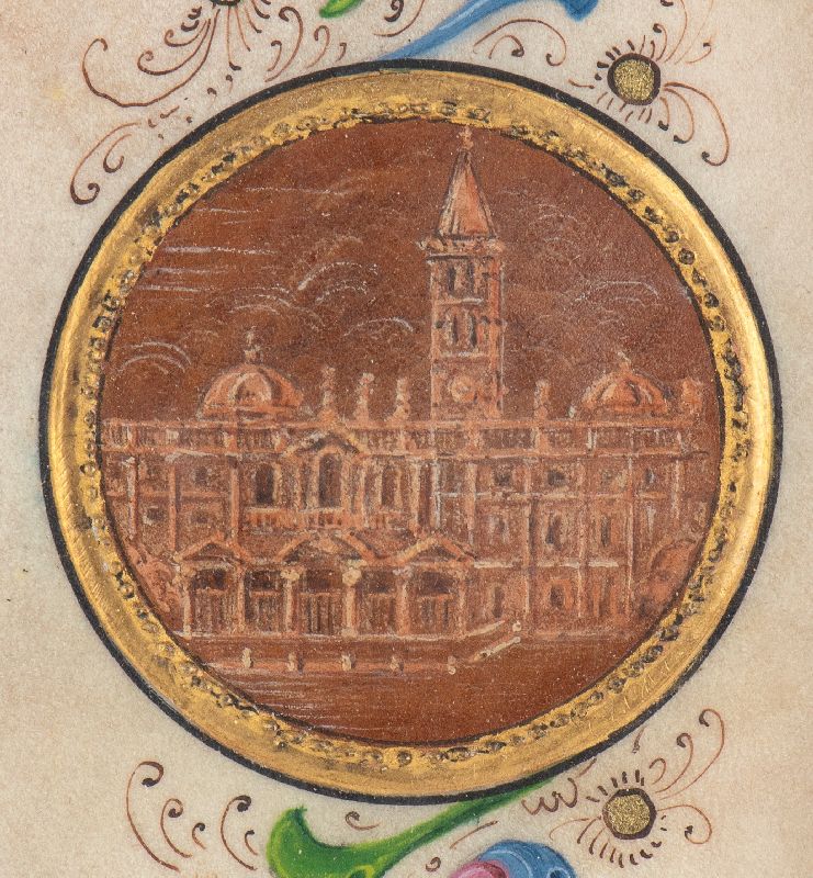 La pergamena al centro del lato corto superiore, riporta lo stemma di Papa Giovanni XXIII (Di rosso, alla fascia d'argento, alla torre al naturale chiusa e finestrata di nero attraversante sul tutto e accostata in capo da due gigli d'argento, col capo patriarcale di Venezia: d'argento, al leone alato passante, guardante e nimbato, tenente con la branca anteriore destra un libro aperto recante la scritta PAX TIBI MARCE EVANGELISTA MEUS, il tutto d'oro) e tutto intorno una cornice di foglie e germogli colorata nelle tonalità di azzurro, rosa, verde ed arancio, con dettagli color oro in rilievo, che unisce 4 applicazioni realizzate a sbalzo su placche tonde di cuoio con cornice color oro, raffiguranti con maestria di dettagli architettonici le basiliche romane di San Pietro, San Giovanni in Laterano, Santa Maria Maggiore e San Paolo fuori le mura. La pergamena è firmata in basso a sinistra "E. VILLA"