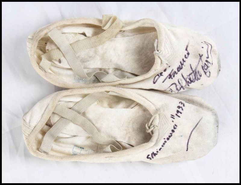 Paio di scarpette "mezzepunte" da danza classica, in tessuto bianco, con dedica ed autografo originali scritti a pennarello nero da Raffaele Paganini. Usate nello "Schiaccianoci" , 1993. Famoso ballerino italiano, attore, nominato "Danseur étoile" dall'Opera di Roma.