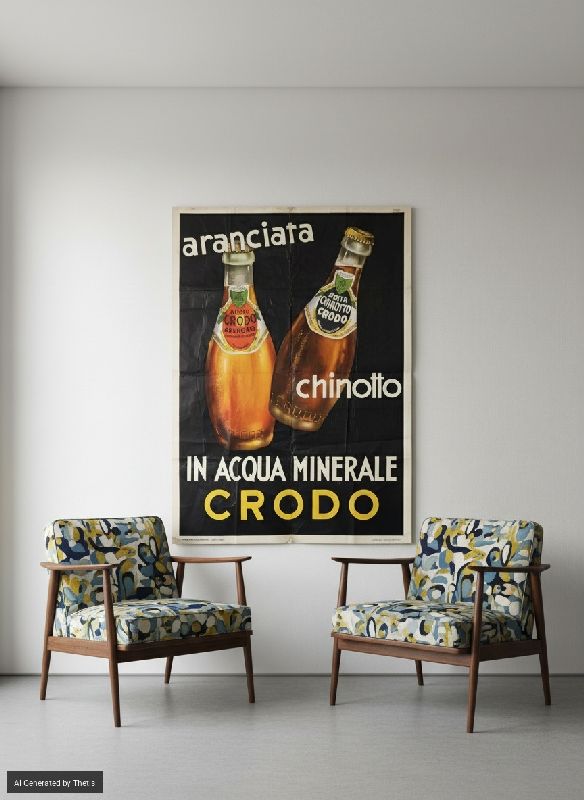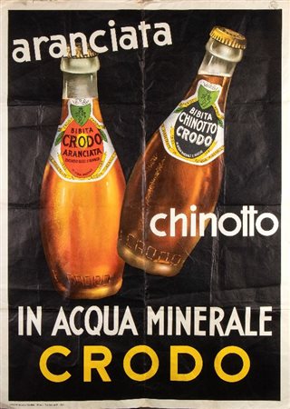 Manifesto litografico pubblicitario per "ARANCIATA CRODINO in Acqua Minerale CRODO" - Stampatore in basso a sinistra RIPALTA INDUSTRIE GRAFICHE - Milano Via Anfossi 17 - 1957. Non telato, pieghe, lievi strappi ai bordi, buone condizioni. Misure cm.100x140