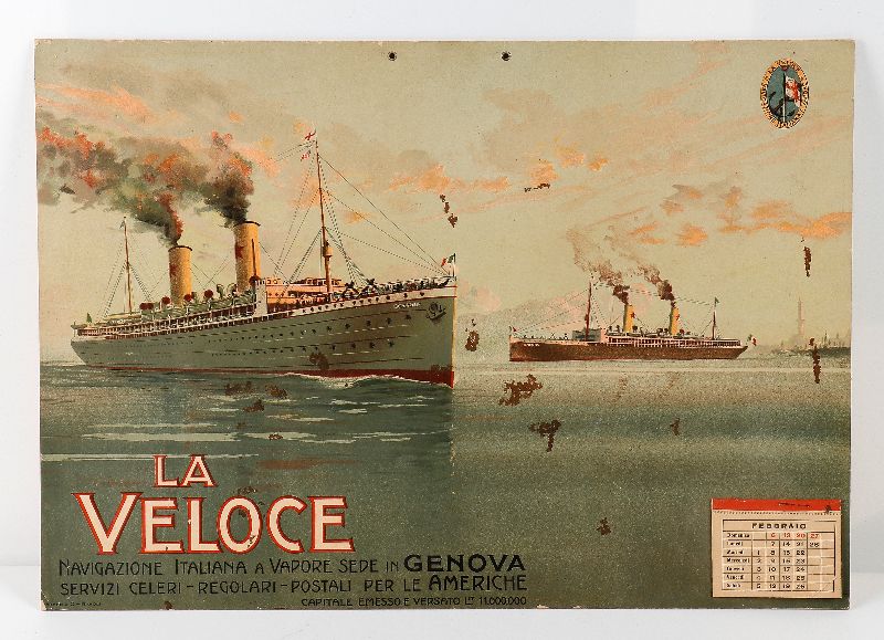 Cartoncino pubblicitario per LA VELOCE Navigazione Italiana a Vapore con sede in Genova. Stampato dagli stabilimenti Richter & C. Napoli , anni '910, segni del tempo, calendario applicato mancante del mese di Gennaio. Misure circa cm.47x33. Condizioni buone