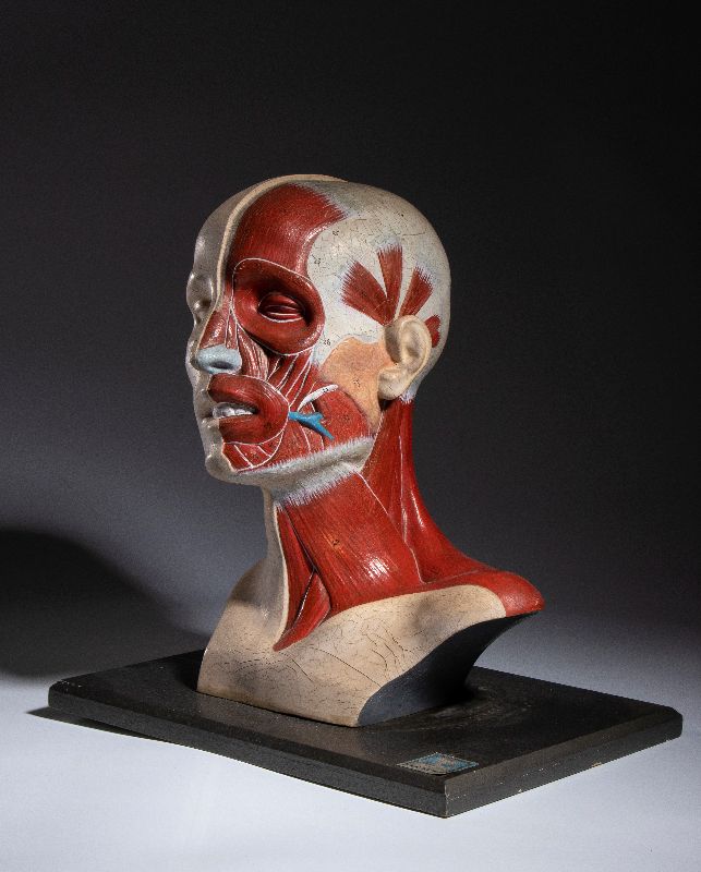 Busto didattico di uomo, con spaccato della testa per metà a mostrare la muscolatura facciale.