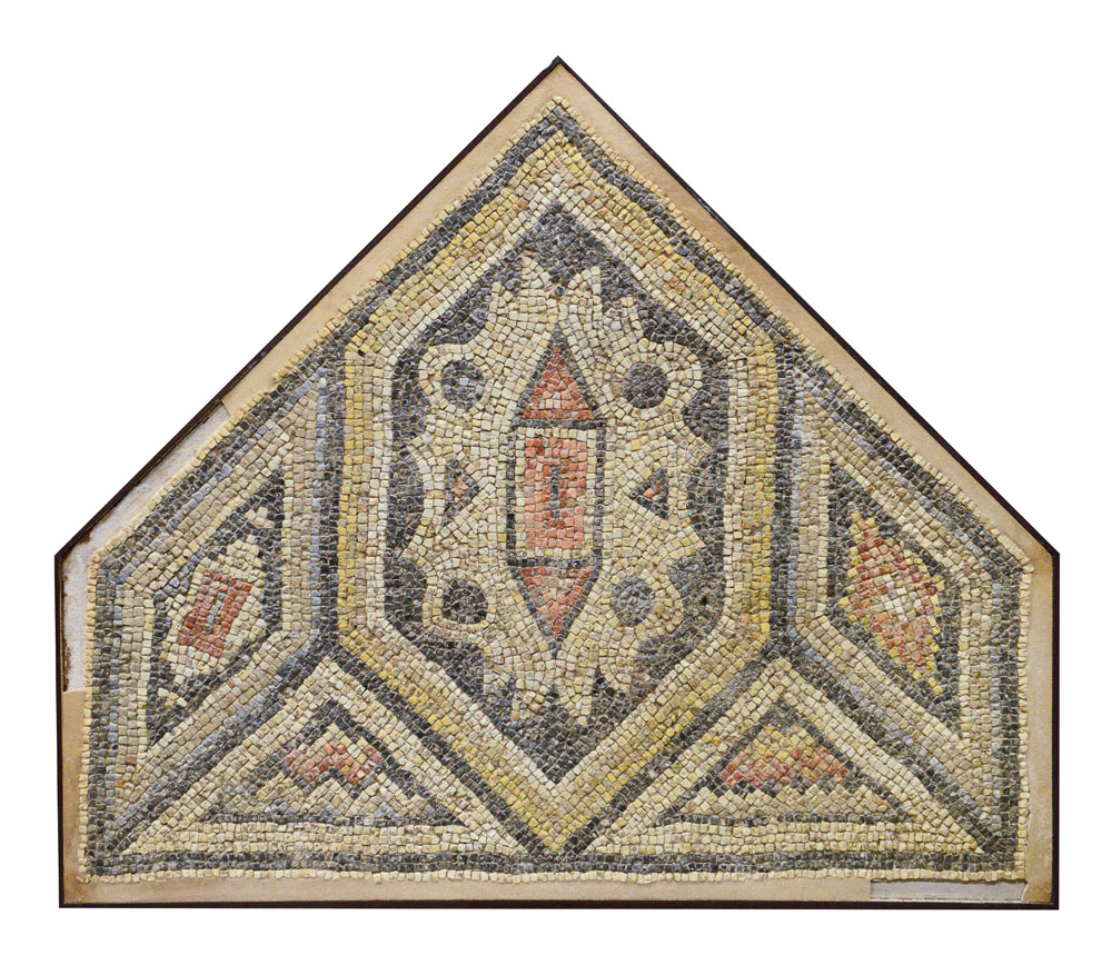 MOSAICO BIZANTINO A TESSERE POLICROME, VI-VII SECOLO, di forma trapezoidale con decoro a motivi stilizzati entro riserve geometriche; montato su pannello; danni e mancanze.