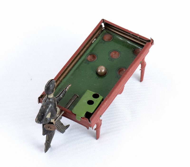 Penny toy, in latta litografata, primi '900. Giocatore di biliardo, con pallina in metallo, Made in Germany. Funzionamento con molla manuale