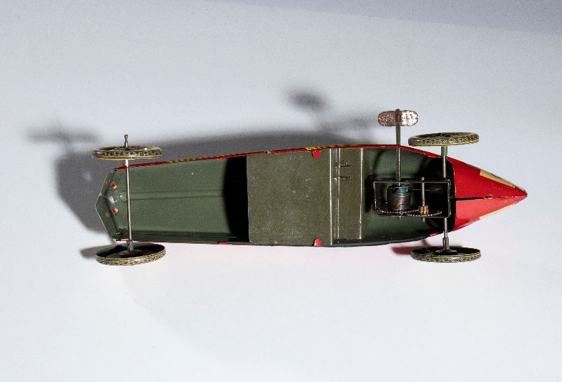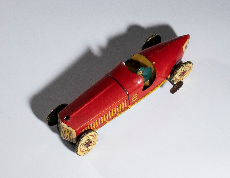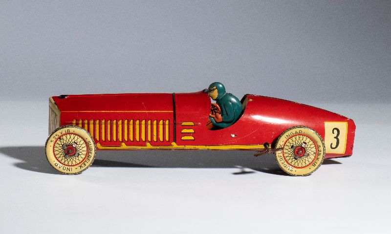 INGAP auto da corsa, latta litografata, pilota originale, carica a molla funzionante.