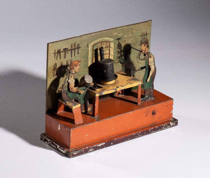 Automi per macchina a vapore, due fabbri che lavorano in officina, latta litografata, marcato BING GBN BAVARIA. Originale anni '920, funzionante, in buone condizioni