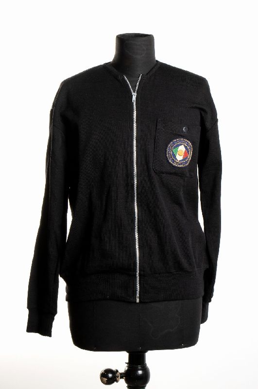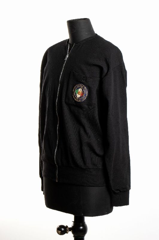 Giacchino nero per arbitro federale di calcio. Con taschino porta cartellino, chiusura con bottone nero. Patch tonda applicata al taschino al petto, in cotone e canutiglia ricamata, recante la dicitura FEDERAZIONE ITALIANA GIUOCO CALCIO - ARBITRO , con pallone riportato su rombo tricolore. Taglia 50, zip. In ottime condizioni