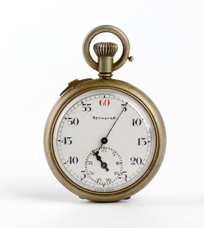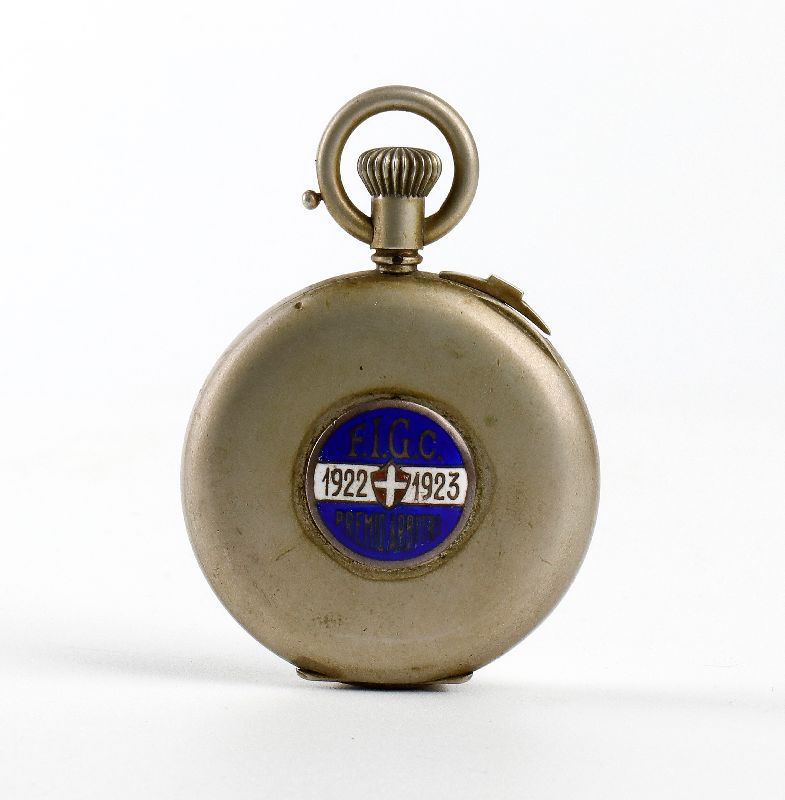 Cronometro marcato REFMETAR, con smalto al retro della F.I.G.C. 1922 1923 PREMIO ARBITRI , donato ad arbitro (non meglio identificato) per la sua attività durante il campionato di calcio del 1922-23. Funzionamento non testato. Diametro circa cm.5 esclusa la corona