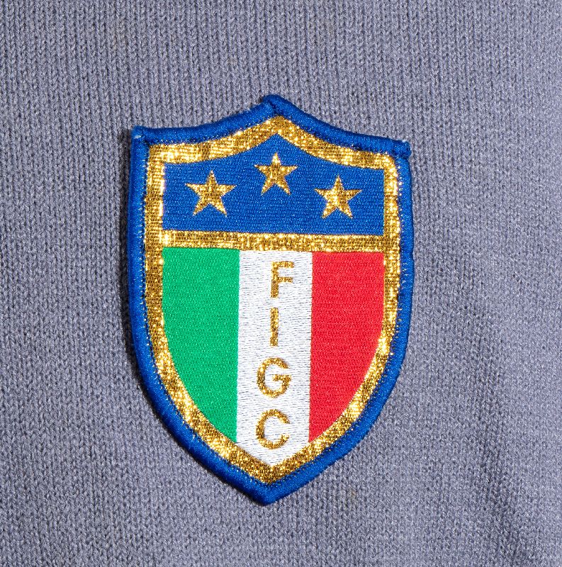 Sul fronte: stemma della Federazione Italiana Giuoco Calcio scudetto ITALIA tricampione mondiale, in materiale sintetico con dettagli color oro riflettenti