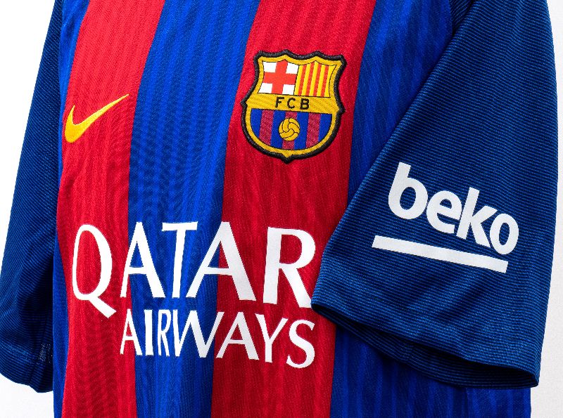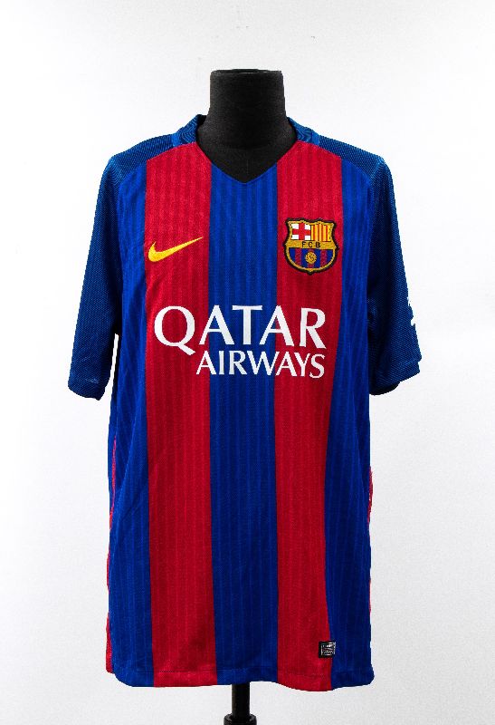 Maglia preparata/indossata da Ronaldinho, per la probabile preparazione all'incontro di vecchie glorie Barcellona-Manchester United del 30-6-2017. Lo sponsor QATAR figurerà dal 2013 per restare sulle maglie fino a quella partita del giugno 2017, e questa è una maglia ufficiale della stagione 2016-2017 che sarebbe poi stata indossata da Ronaldinho. In perfette condizioni.