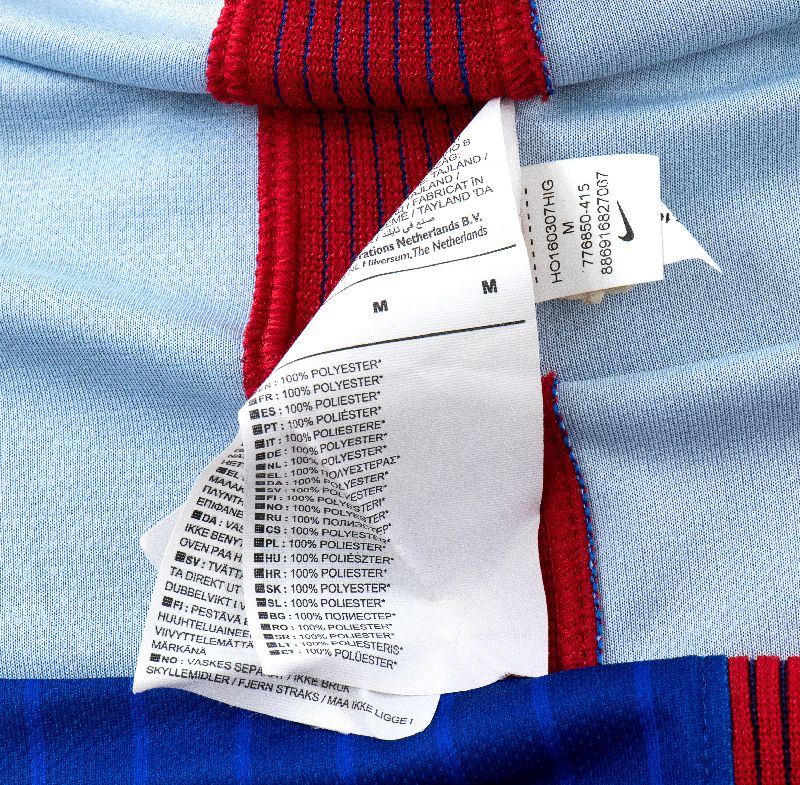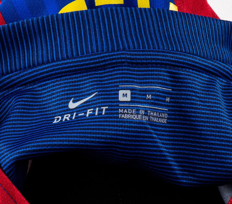 Sul fronte: sponsor tecnico NIKE cucito, stemma del Barcellona ricamato, sponsor QATAR AIRWAYS