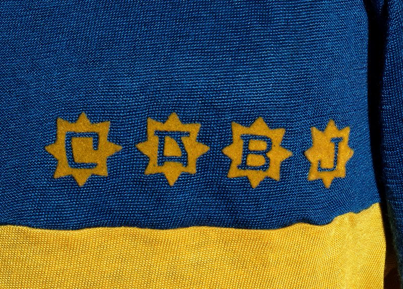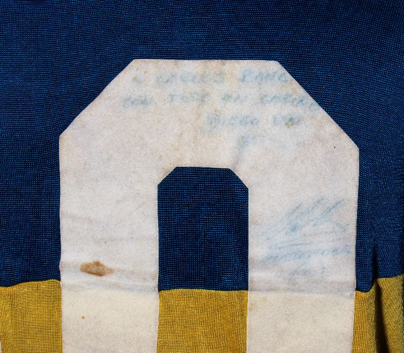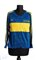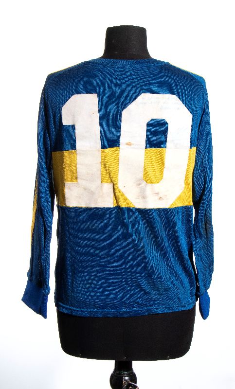 Maglia di gara home del Boca Juniors (Club Atletico Boca Juniors), stagione 1981-82, blu con fascia orizzontale gialla, maniche lunghe con profilature gialle dal collo al polsino della manica.