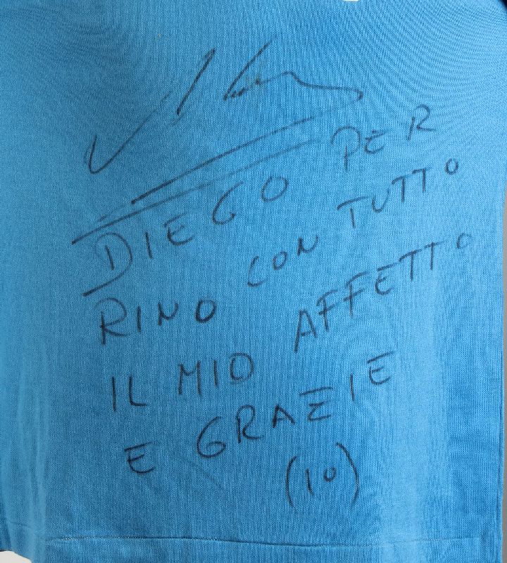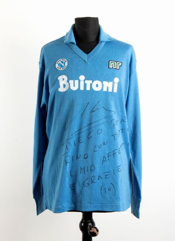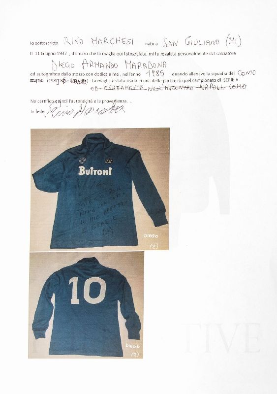 La maglia proviene dalla collezione personale del "mister" Rino Marchesi allenatore del Napoli nella stagione 1984-85, che legò uno stretta amicizia con Maradona (si sentirono telefonicamente anche pochi giorni prima della scomparsa del Pibe de Oro) dal quale ebbe in regalo questa maglia con la dedica "per Rino con tutto il mio affetto". La maglia verrà accompagnata da certificato autografo del mister Marchesi.
