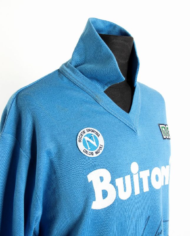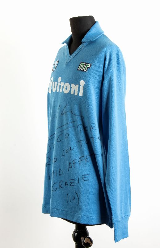 Maglia di calcio del Napoli stagione 1985-86, indossata da Diego Armando Maradona in una delle partite di quel campionato di serie A. Con dedica e firma autografe di Maradona a pennarello nero.