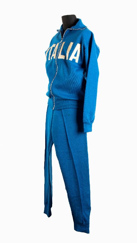 Tuta della nazionale italiana di calcio, appartenuta a Rino Marchesi, 1961-62, completa di giubbino e pantaloni. In cotone, scritta ITALIA in materiale sintetico con lettere cucite singolarmente, etichetta interna con numero di taglia 50, pantaloni con zip alla caviglia. In ottime condizioni. Fornita di certificato di autentica firmato da Marchesi